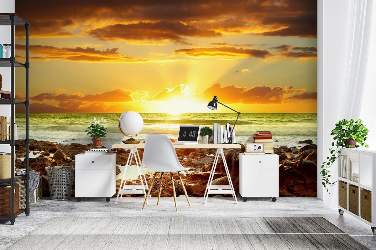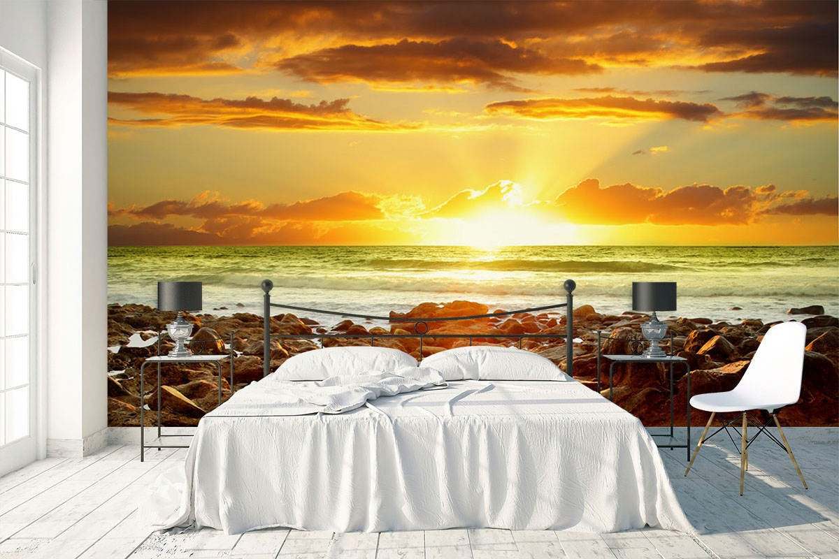 Rocky Beach Nature Sky Orange Wallpaper Mural,Self-Adhesive Peel And Stick 3D Wall Decor,Bedroom Removable Wall Decor