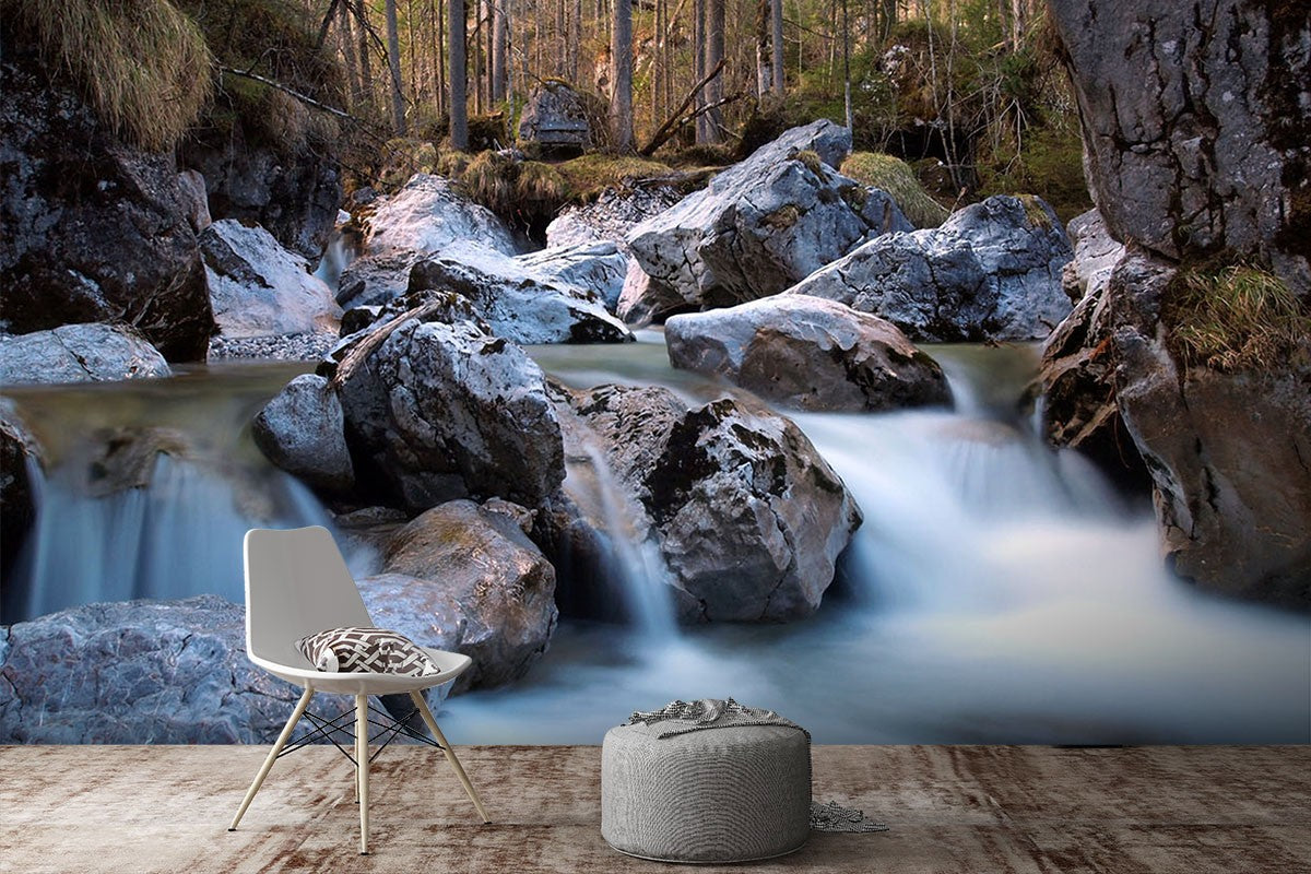 Rocky Stream Nature Waterfall Brown Wallpaper Mural,Self-Adhesive Peel And Stick 3D Wall Mural,Australian Company Bedroom Wall Decor