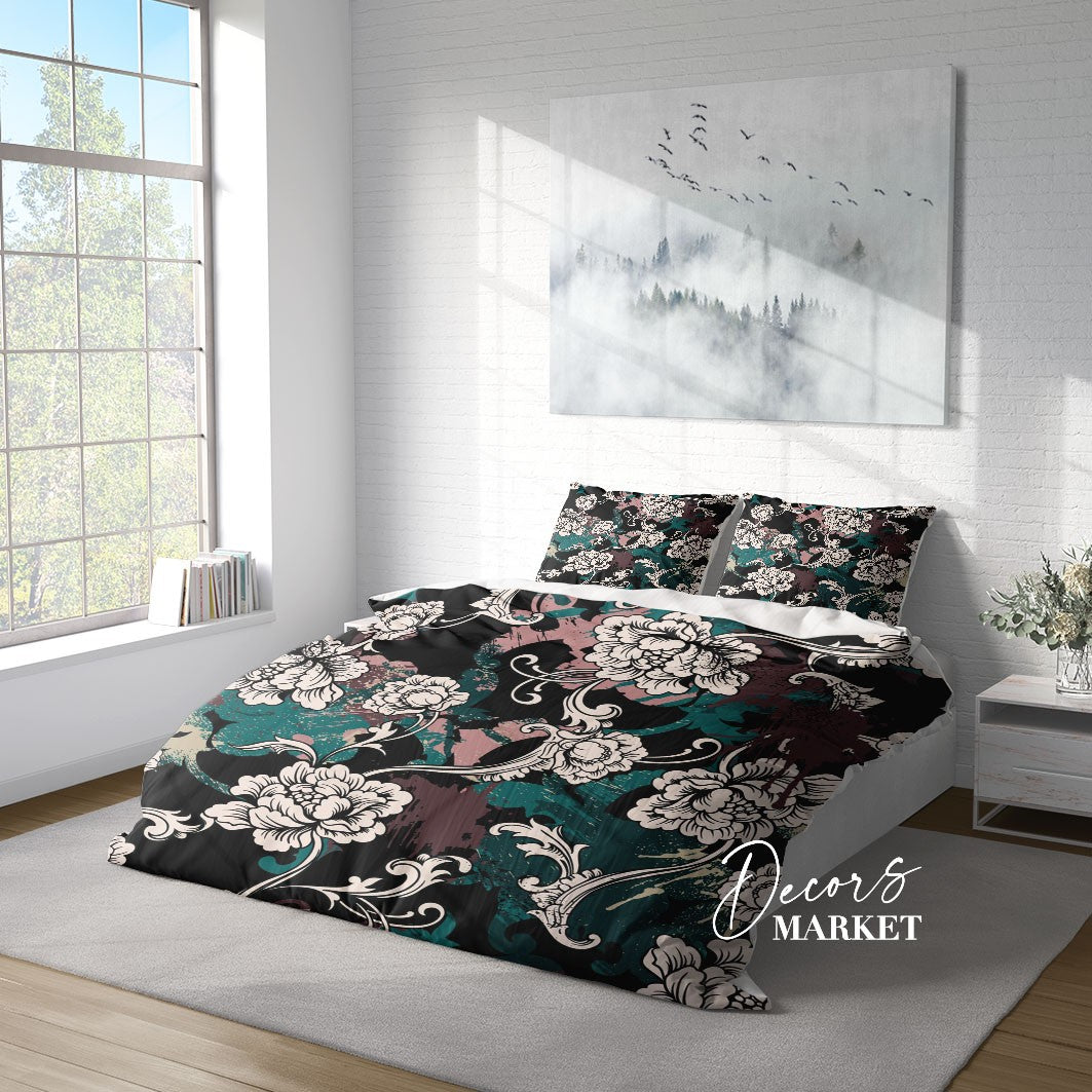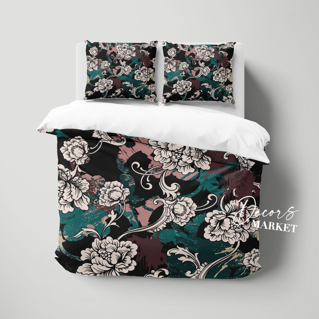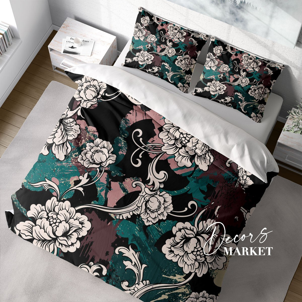 Rococo Roses Smudge Duvet Cover Set w Pillowcases, Black Floral Patterns 3D Quilt Cover, 3pc Single Double Queen King Size Doona Cover