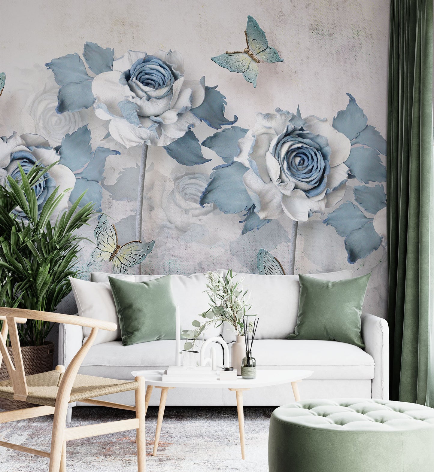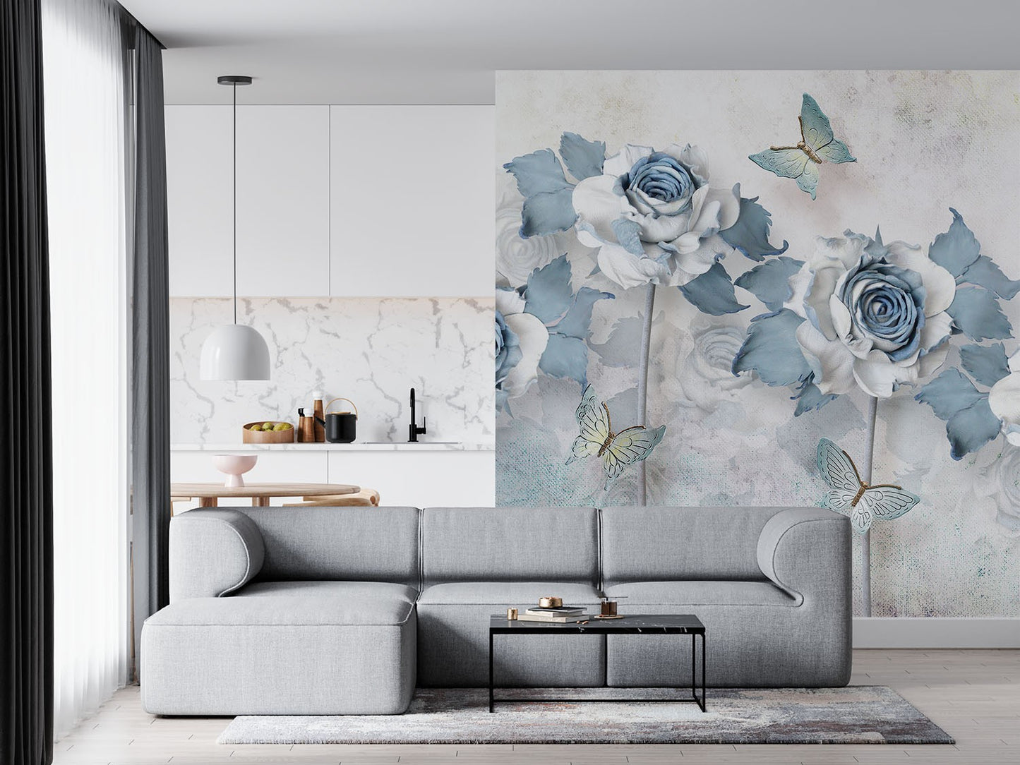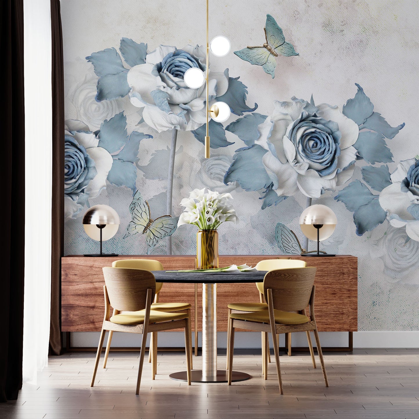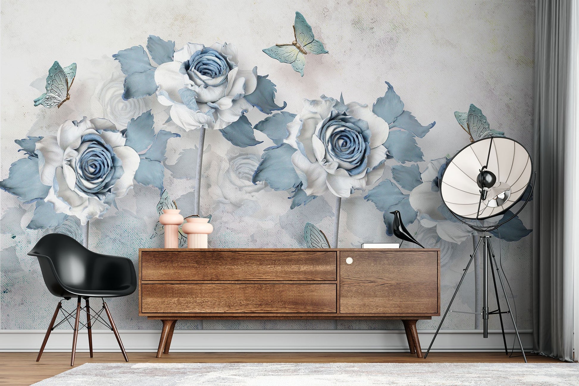 Rose Butterfly Floral Flowers Blue Wallpaper Mural