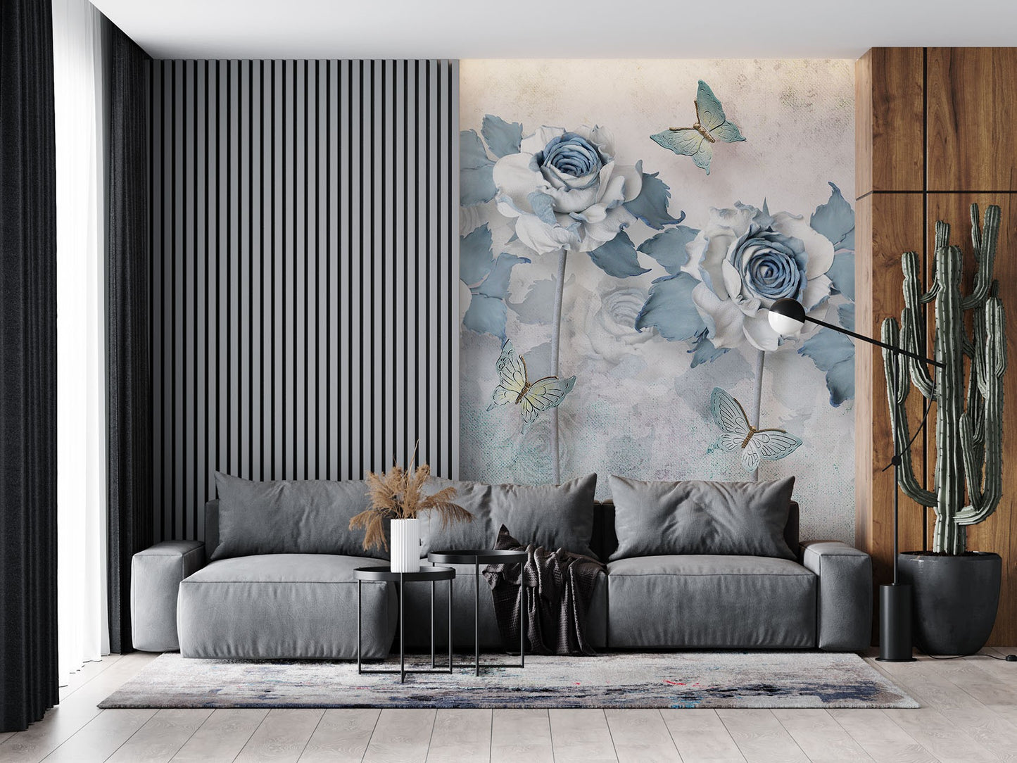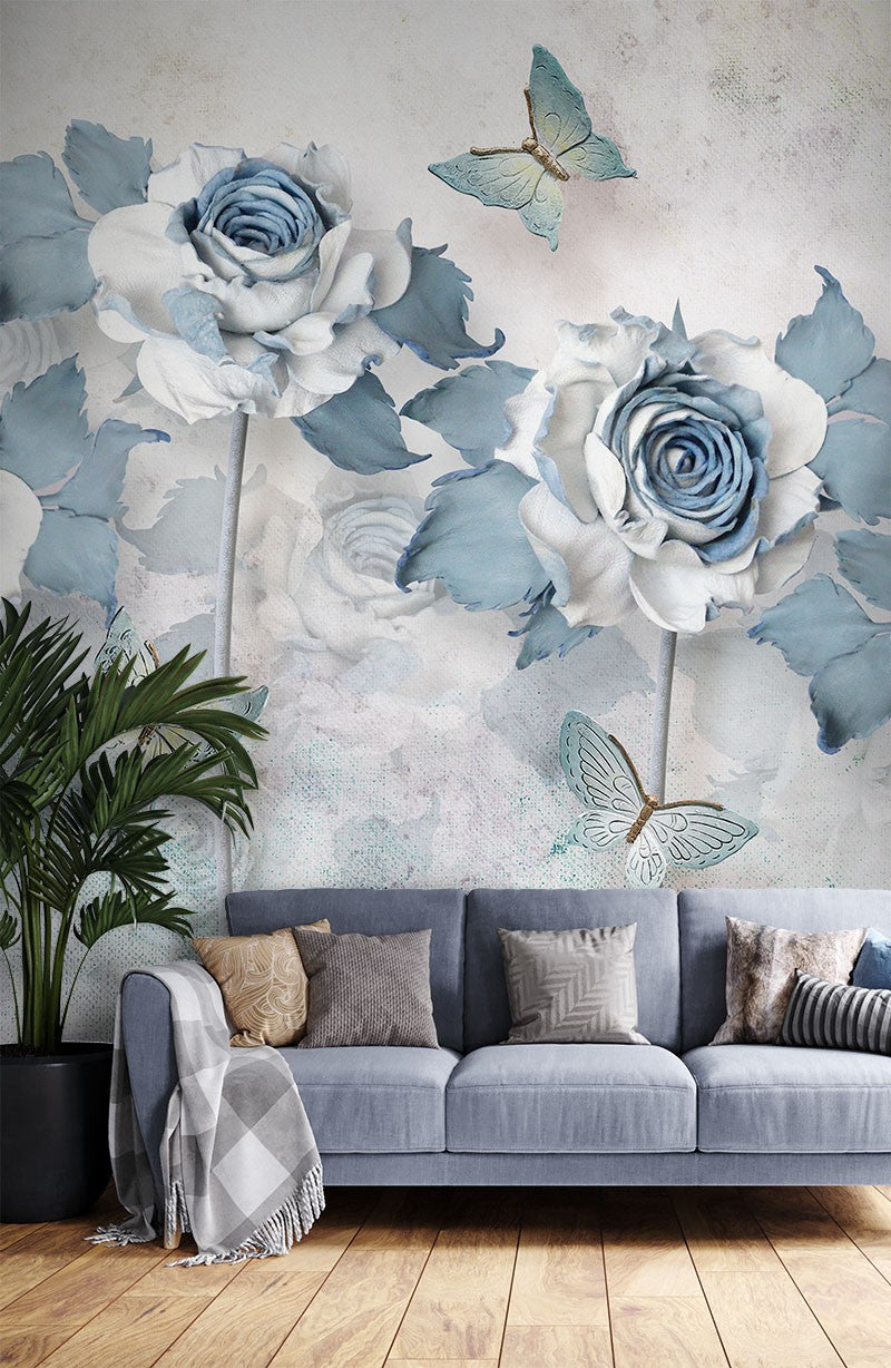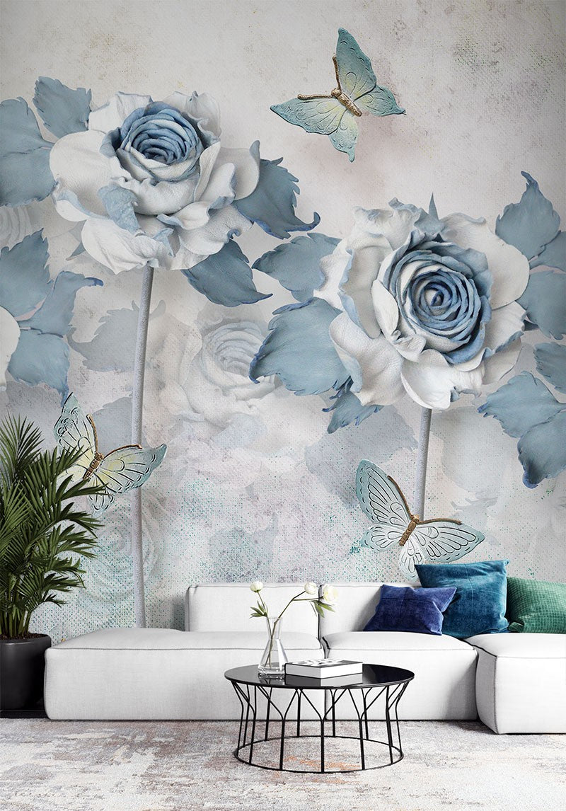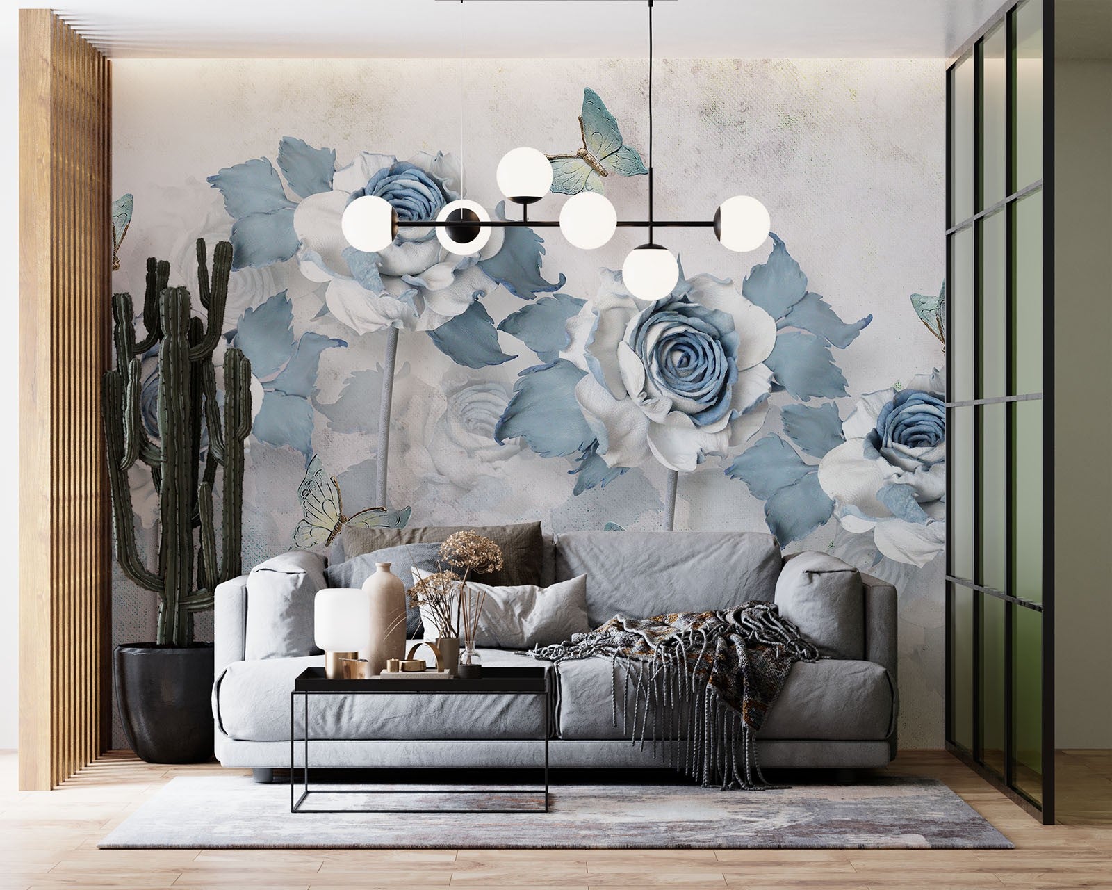 Rose Butterfly Floral Flowers Blue Wallpaper Mural