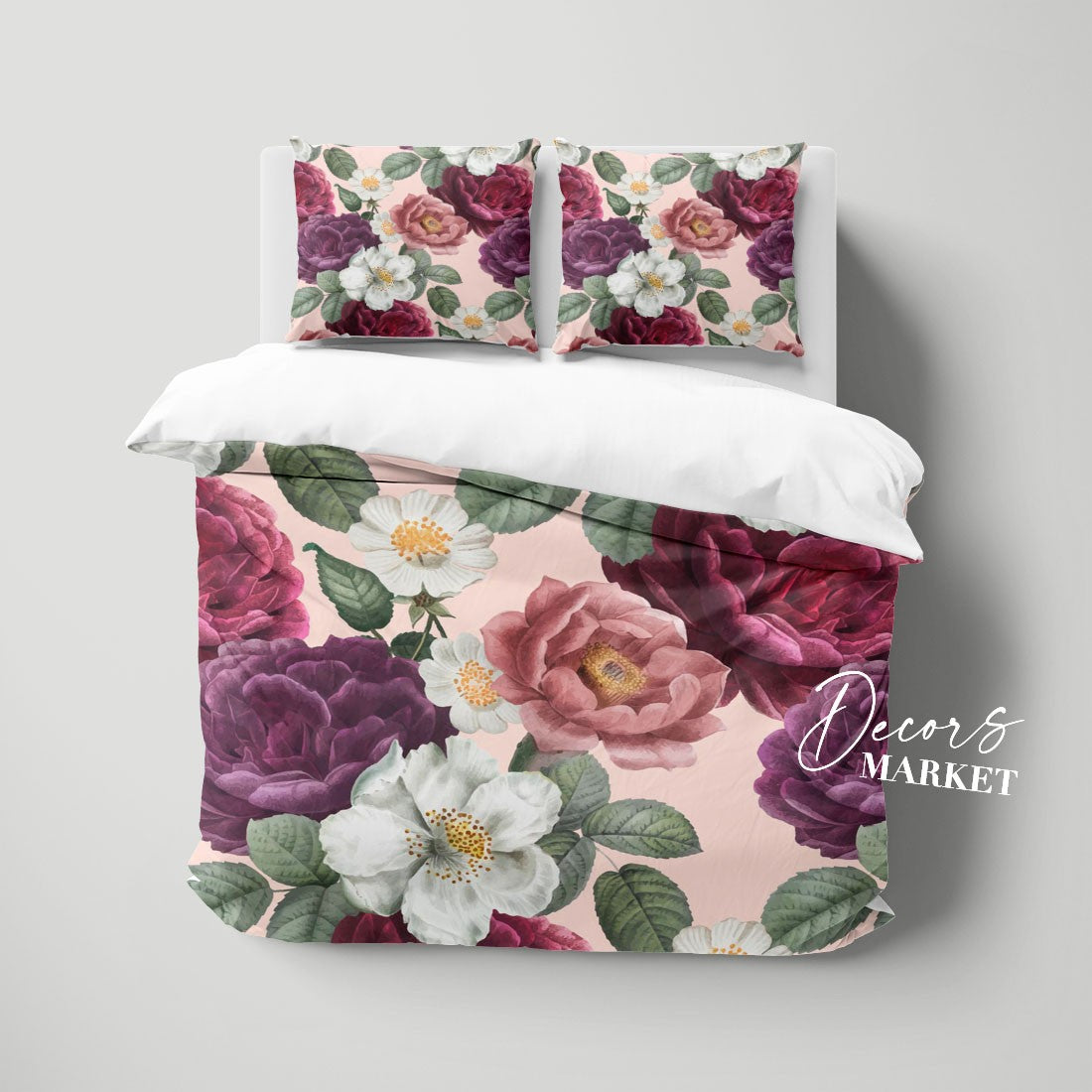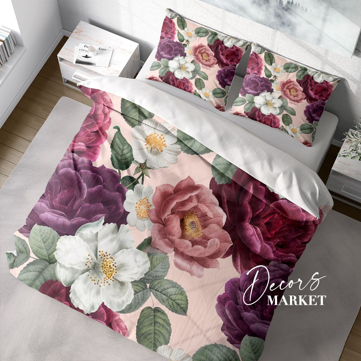 Rose Flower Leaf Art Duvet Cover Set w Pillowcases, Red Floral Patterns 3D Quilt Cover, 3pc Single Double Queen King Size Doona Cover