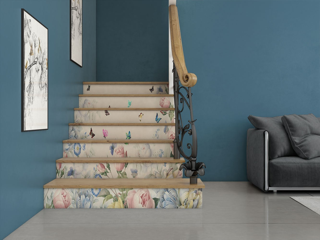 Roses Butterflies Floral Flower Creamy Stair Riser Decals, Waterproof Removable Staircase Decals, Vinyl Peel And Stick Stairs Decal Stickers