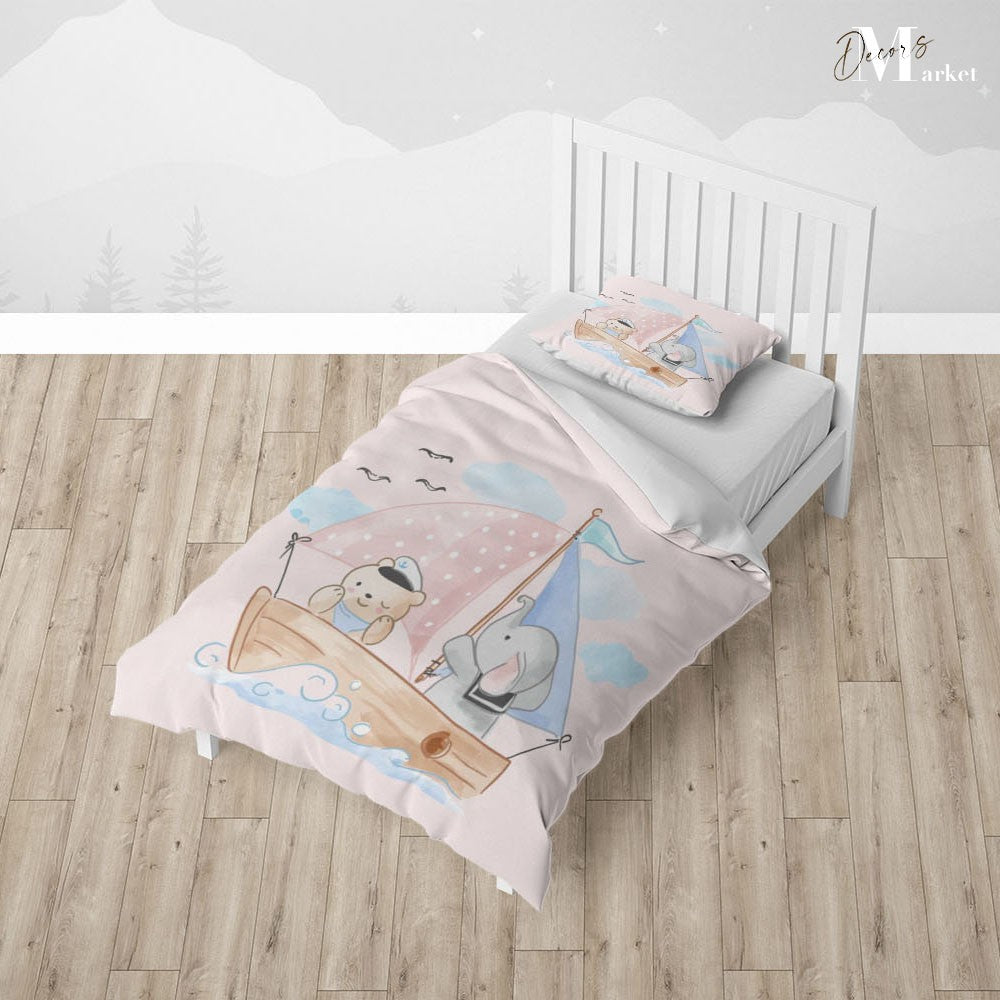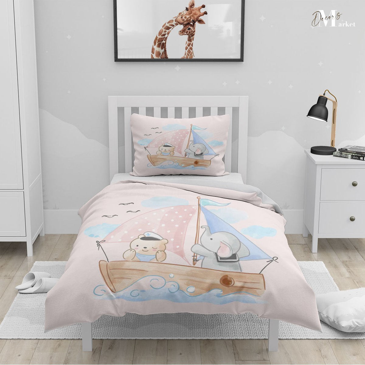 Sailing Bear Elephant Duvet Cover Set w Pillow Cover, Creamy Kids Cartoon 3D Quilt Cover, Single Double Queen King Size Doona Cover
