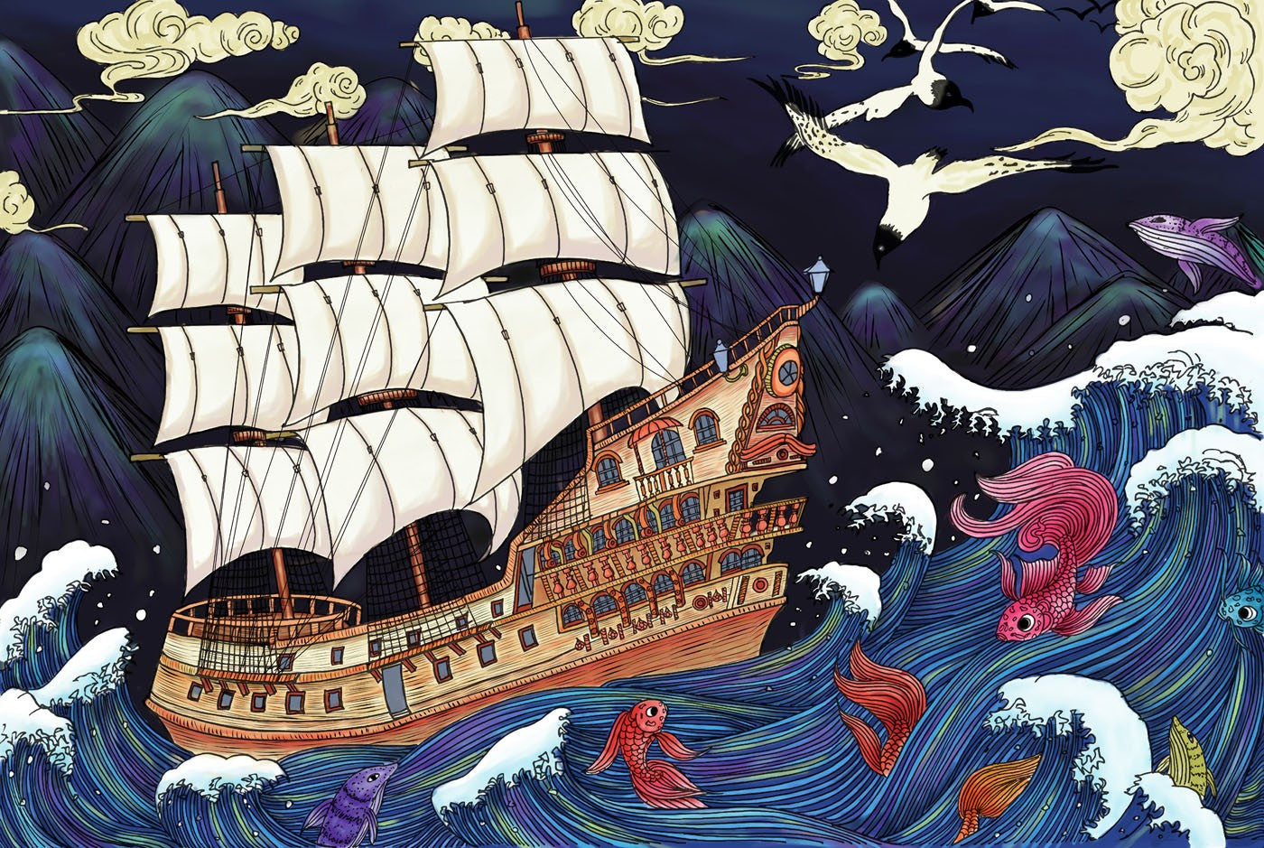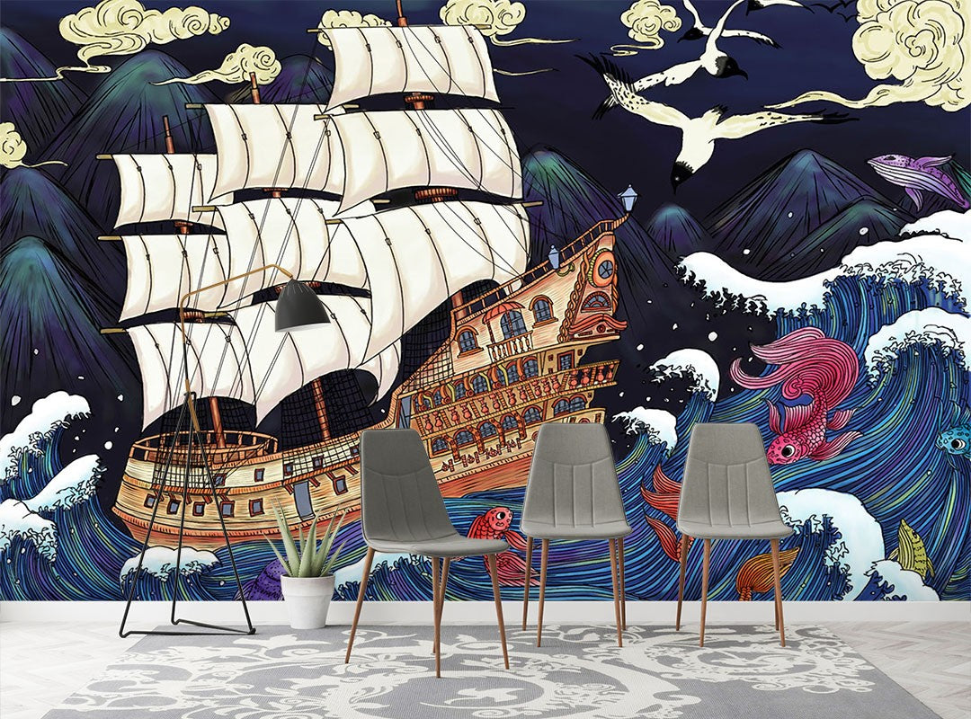 Sailship Waves Art Retro Black Wallpaper Mural,Self-Adhesive Peel And Stick 3D Wall Art,Designer Removable Wall Decor