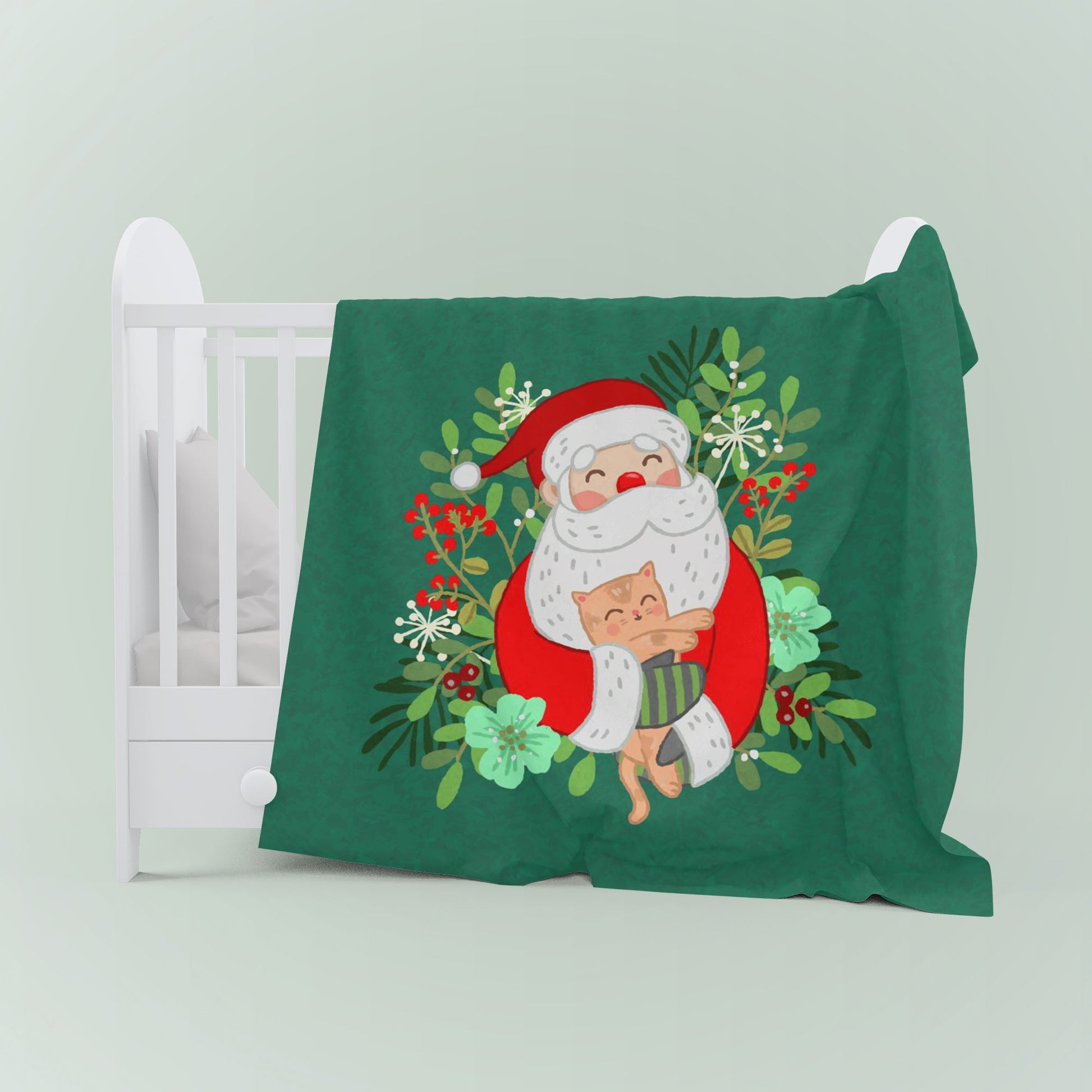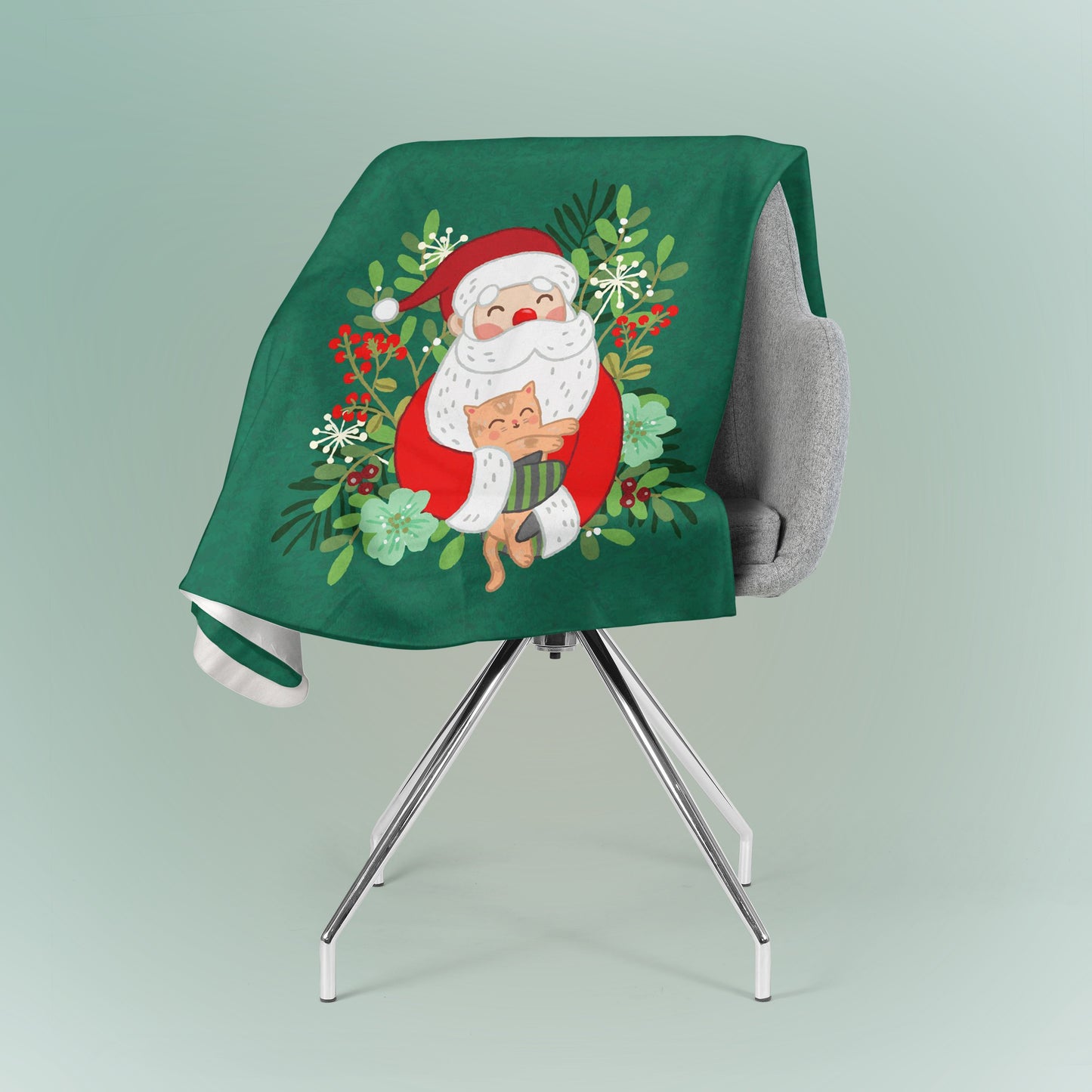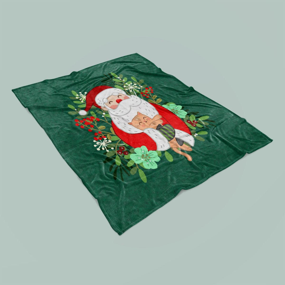 Santa Cat Kids Cartoon Green Personalized Throw Blanket Custom Fleece Sherpa Throw