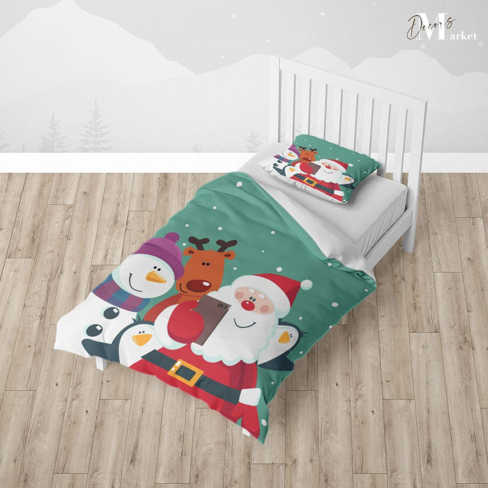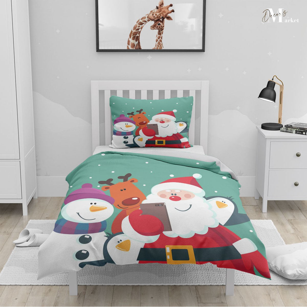 Santa Snowman Selfie Duvet Cover Set w Pillow Cover, Multicolour Kids Cartoon 3D Quilt Cover, Single Double Queen King Size Doona Cover