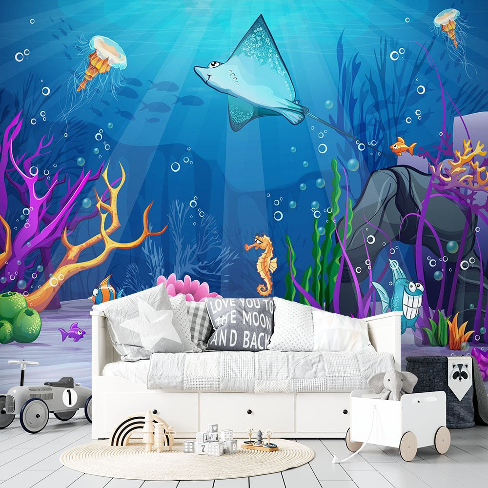 Sea ??Creatures Kids Animal Blue Wallpaper Mural,Self-Adhesive Peel And Stick 3D Wall Art,Removable Designer Wall Decor