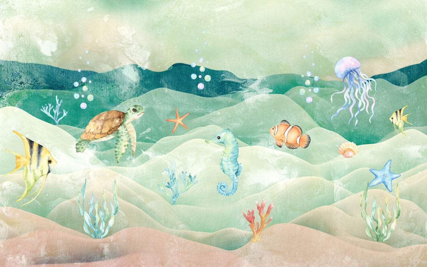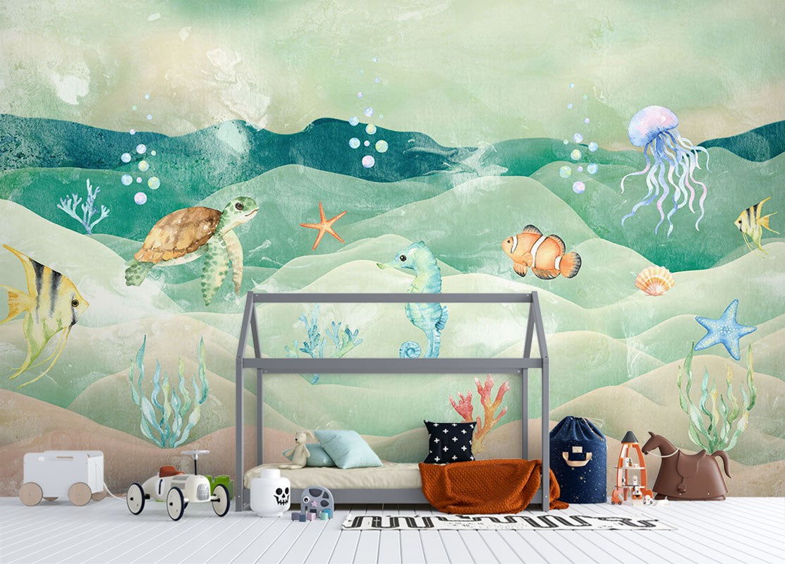 Sea ??Creatures Kids Animal Green Wallpaper Mural,Self-Adhesive Peel And Stick 3D Wall Decal,Designer Bedroom Wall Decor