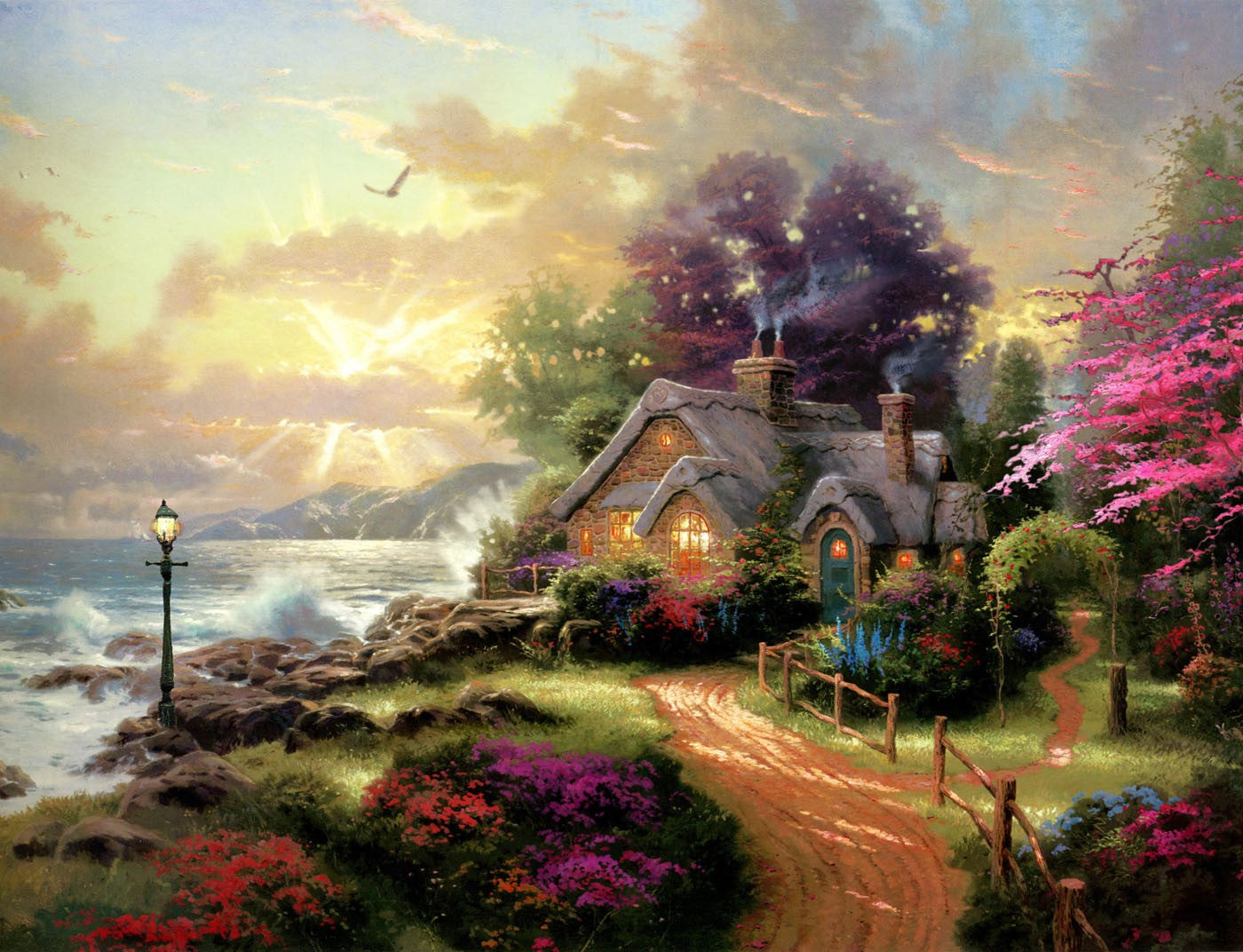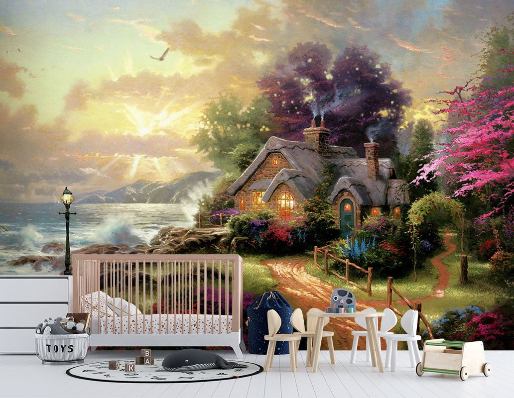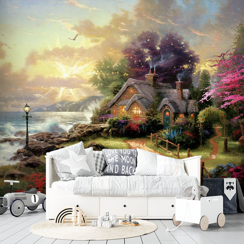 Seaside House Kids Fantasy Bright Wallpaper Mural,Self-Adhesive Peel And Stick 3D Wall Decor,Removable Designer Wall Decor