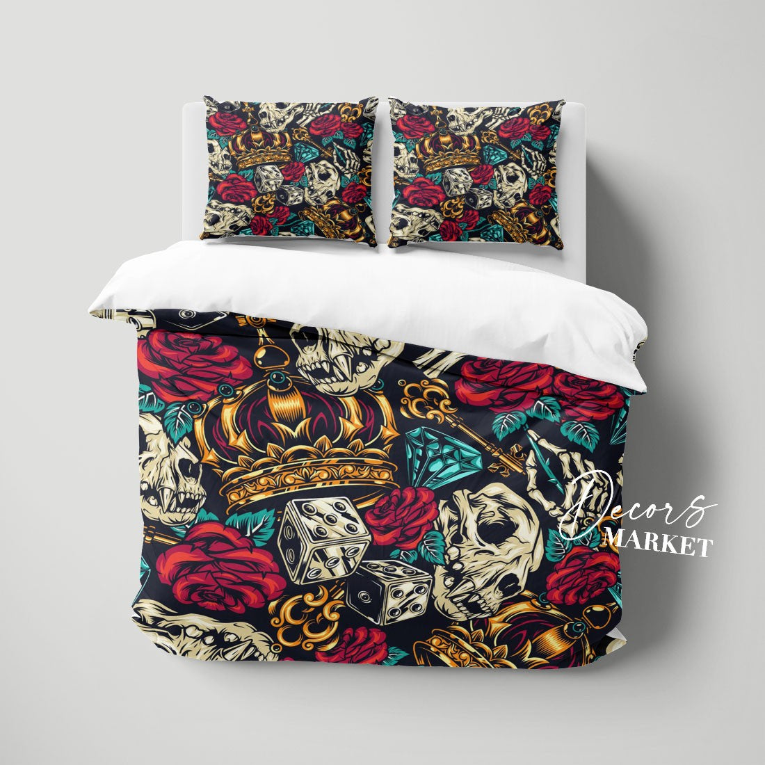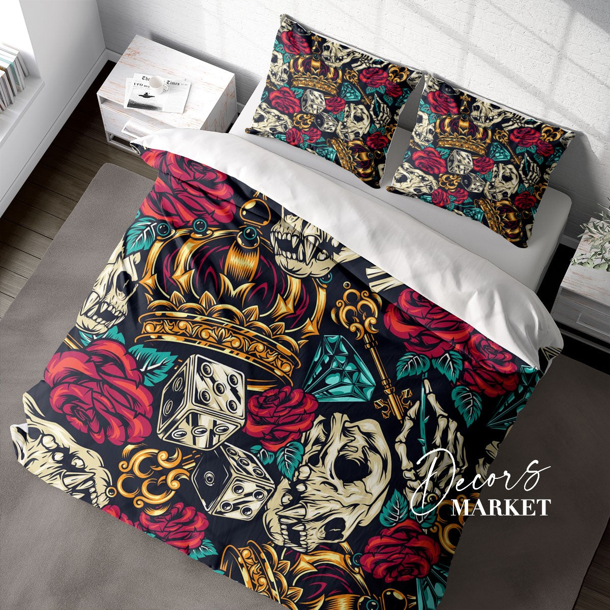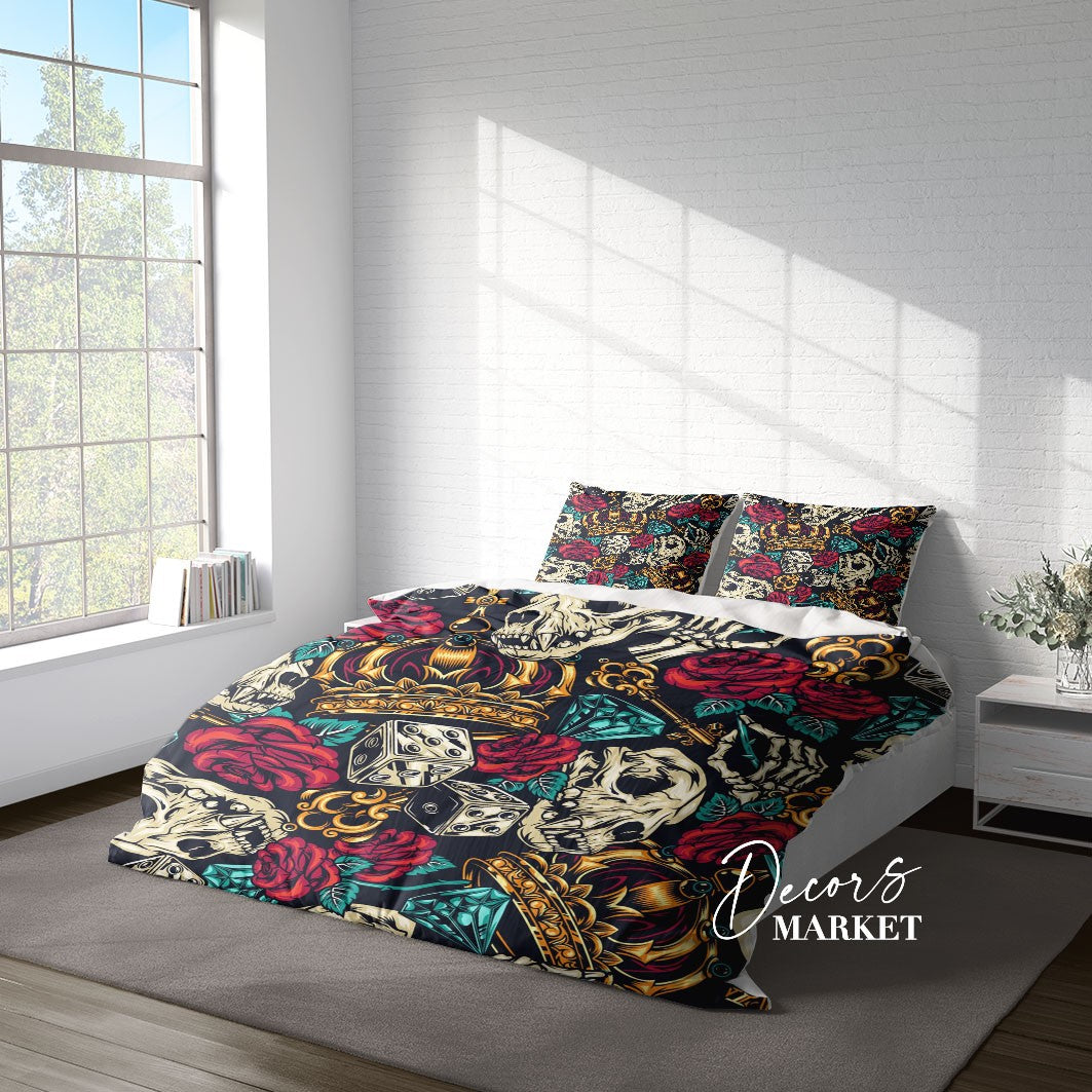Skeleton Rose Duvet Cover Set w Pillowcases, Colorful Art Fantasy 3D Quilt Cover, 3pc Single Double Queen King Size Doona Cover