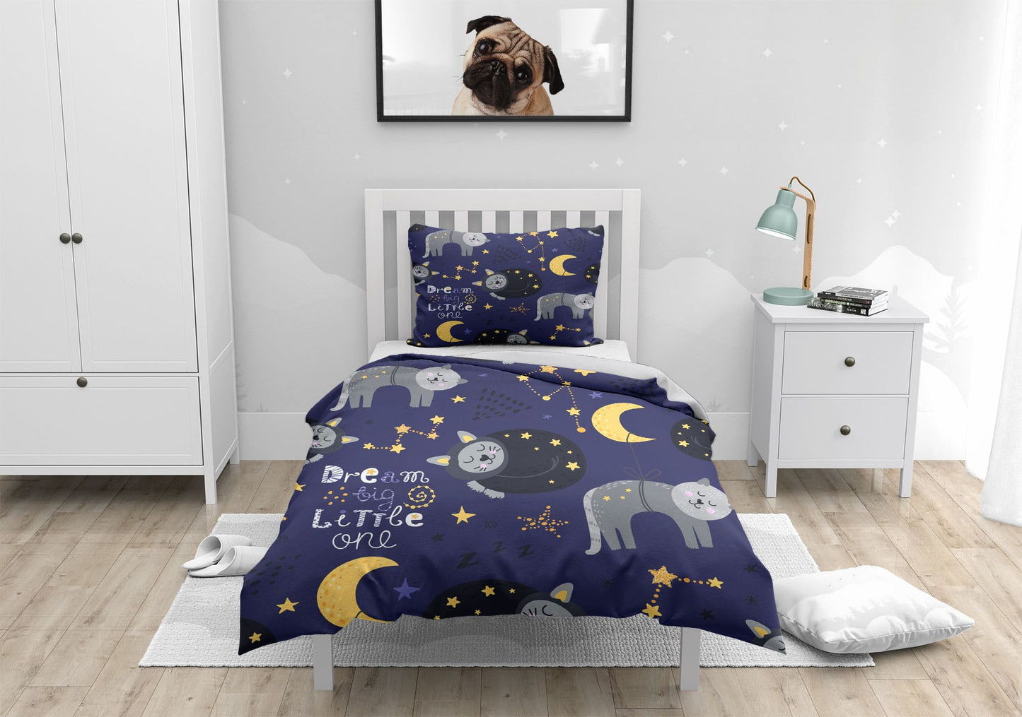 Sleeping Moon Cat Duvet Cover Set w Pillowcases, Blue Kids Cartoon 3D Quilt Cover, 3pc Single Double Queen King Size Doona Cover