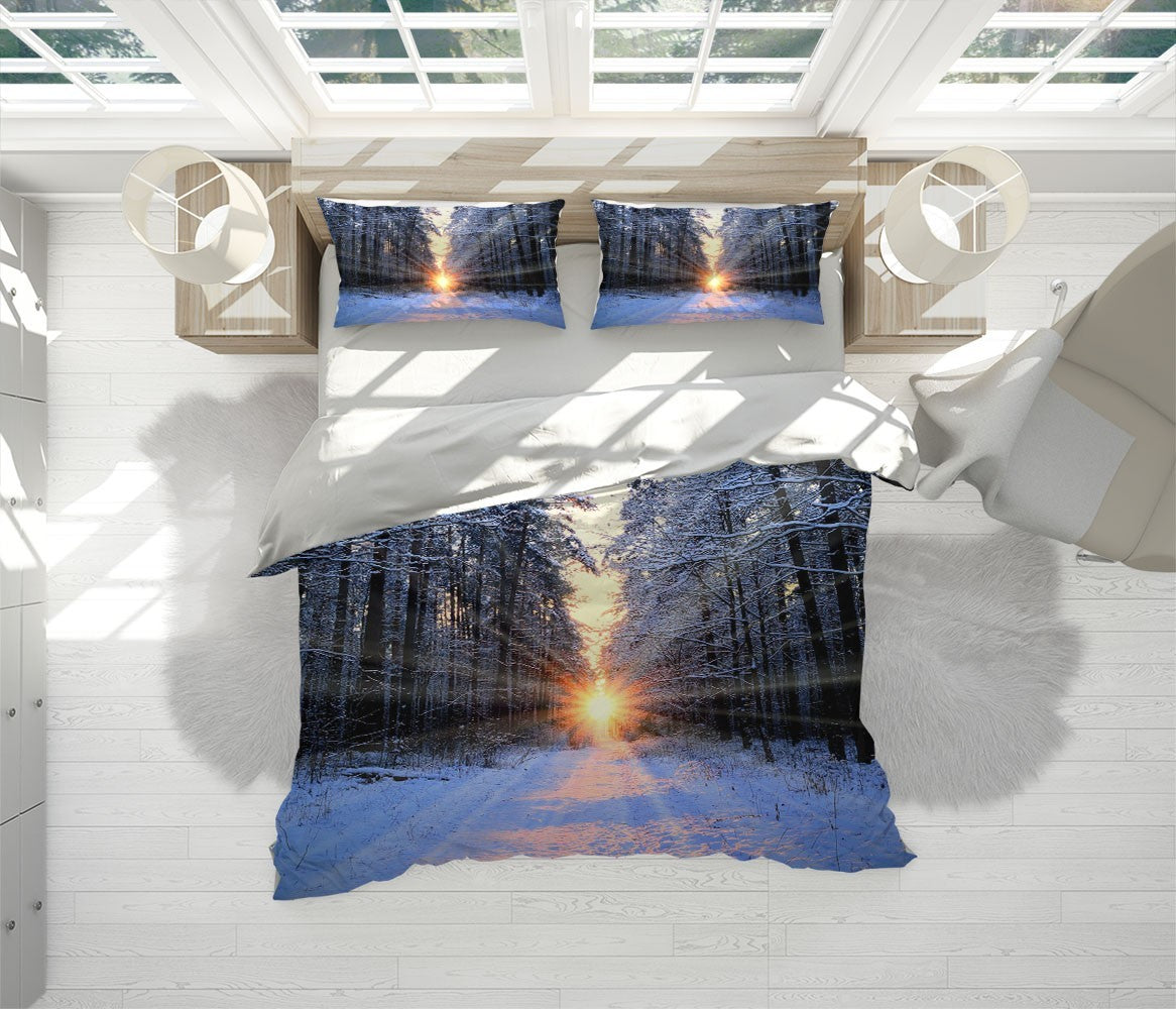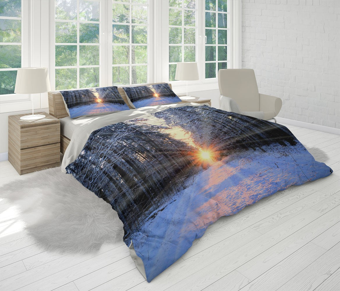 Snow Sunset Duvet Cover Set W Pillow Cover, Black Nature Landscape 3D Quilt Cover, Single Double Queen King Size Doona Cover