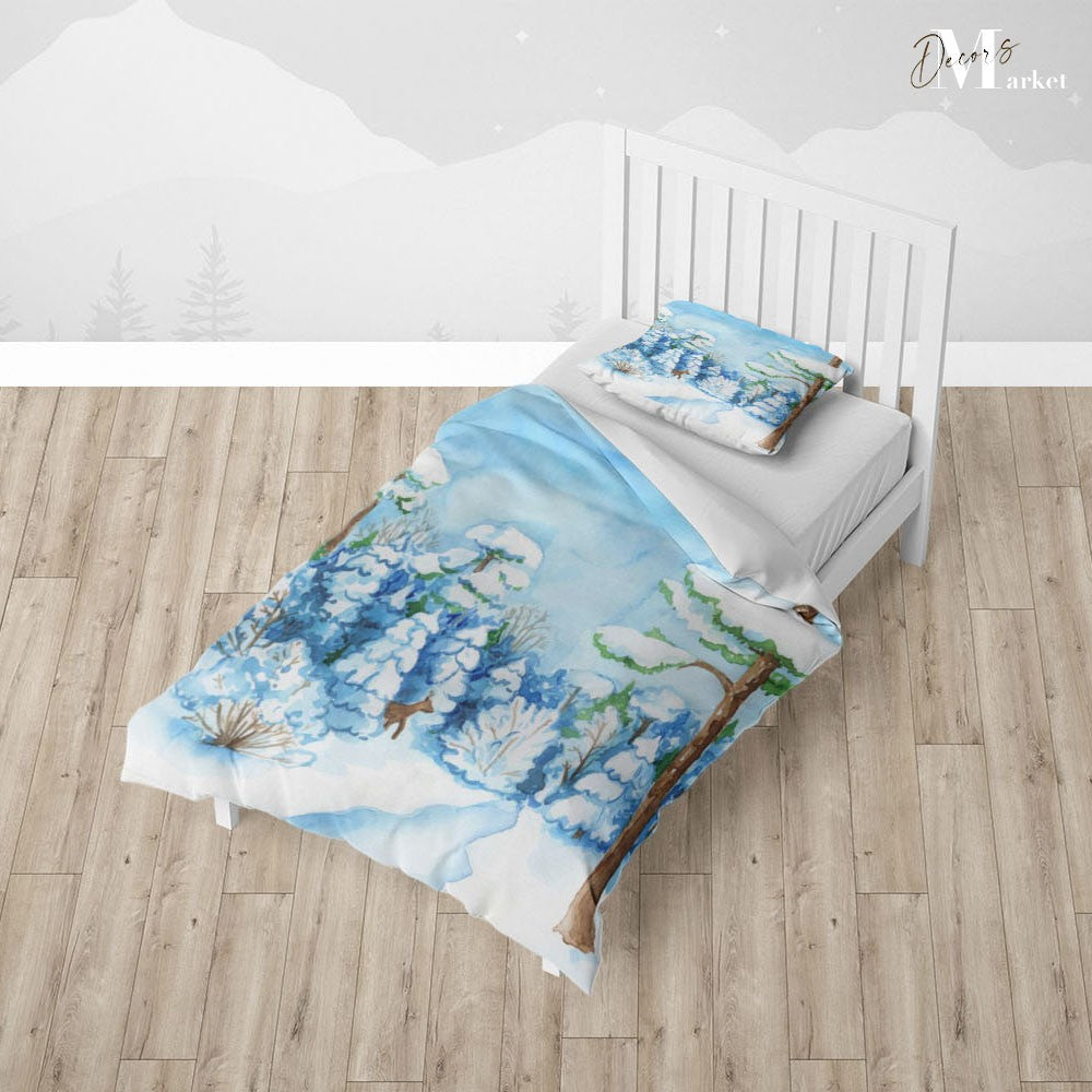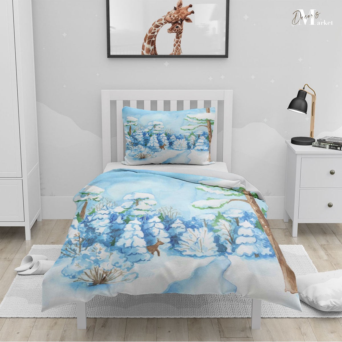 Snow Winter Trees Duvet Cover Set w Pillow Cover, Blue Kids Art For Kids 3D Quilt Cover, Single Double Queen King Size Doona Cover