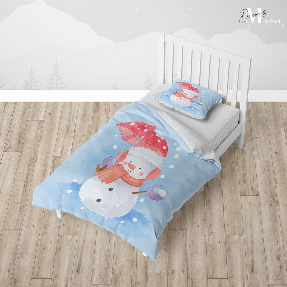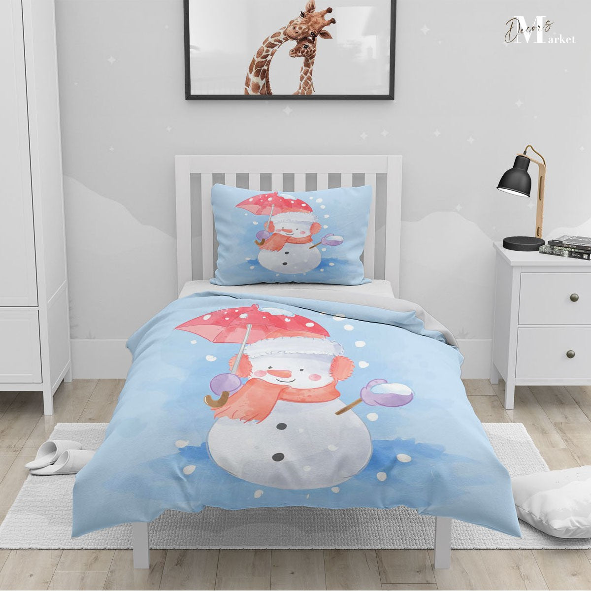 Snowman Umbrella Dance Duvet Cover Set w Pillow Cover, Blue Kids Cartoon 3D Quilt Cover, Single Double Queen King Size Doona Cover