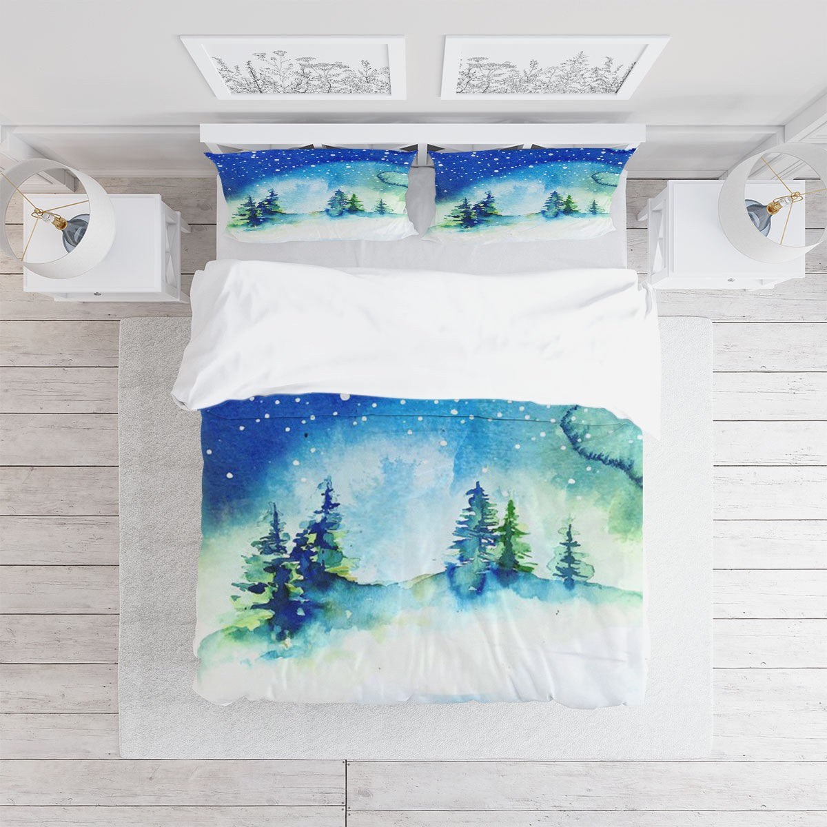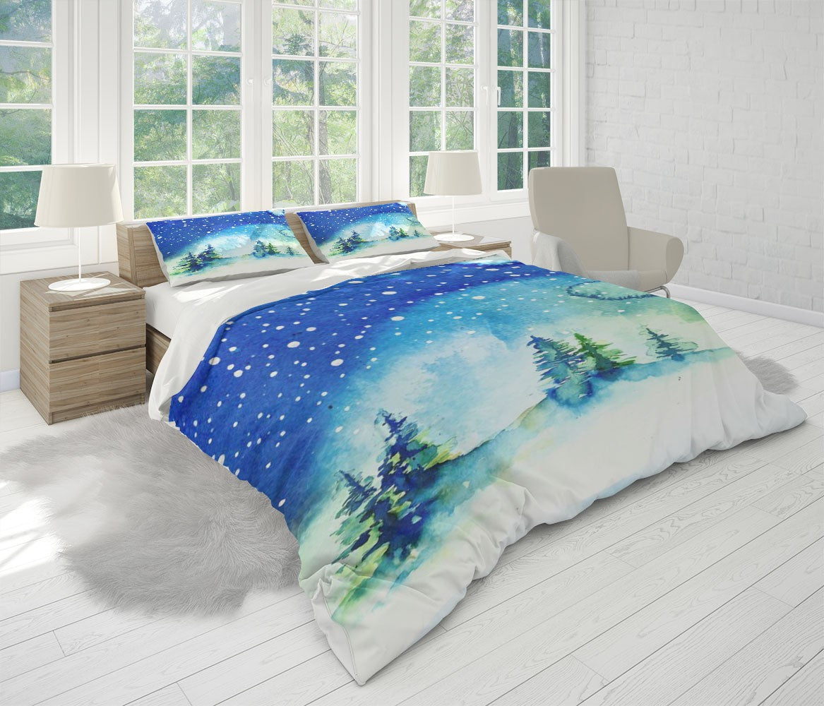 Snowy Forest Watercolor Duvet Cover Set W Pillowcases, Blue Kids Art For Kids 3D Quilt Cover, 3Pc Single Double Queen King Size Doona Cover