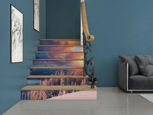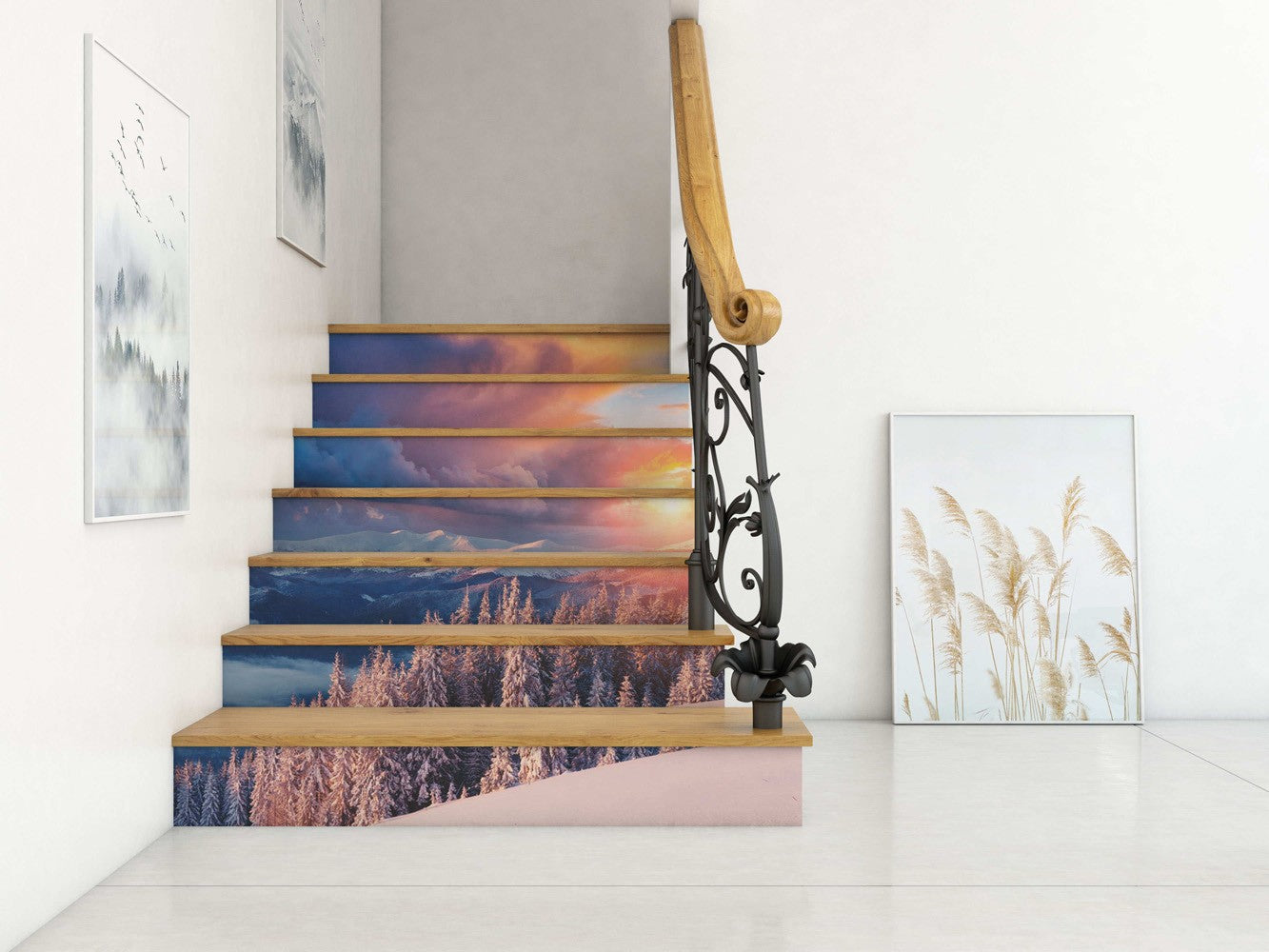 Snowy Mountains Nature Sky Orange Stair Riser Decals, Waterproof Removable Staircase Decals, Vinyl Peel And Stick Stairs Decal Stickers
