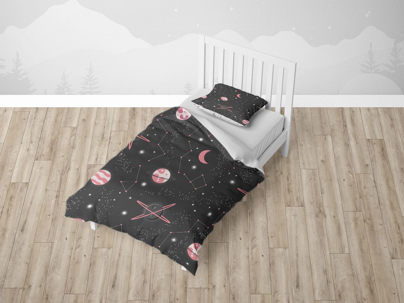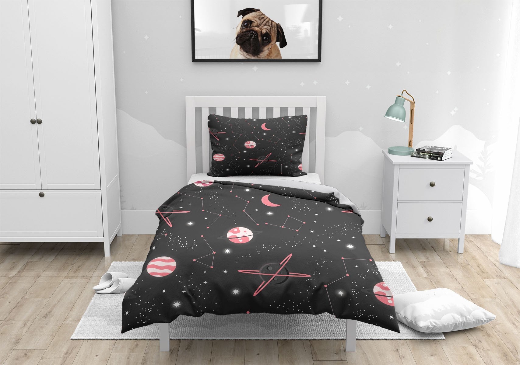 Space Planet Star Duvet Cover Set w Pillowcases, Black Kids Patterns 3D Quilt Cover, 3pc Single Double Queen King Size Doona Cover