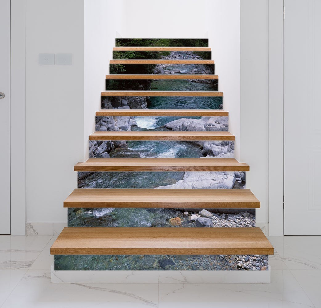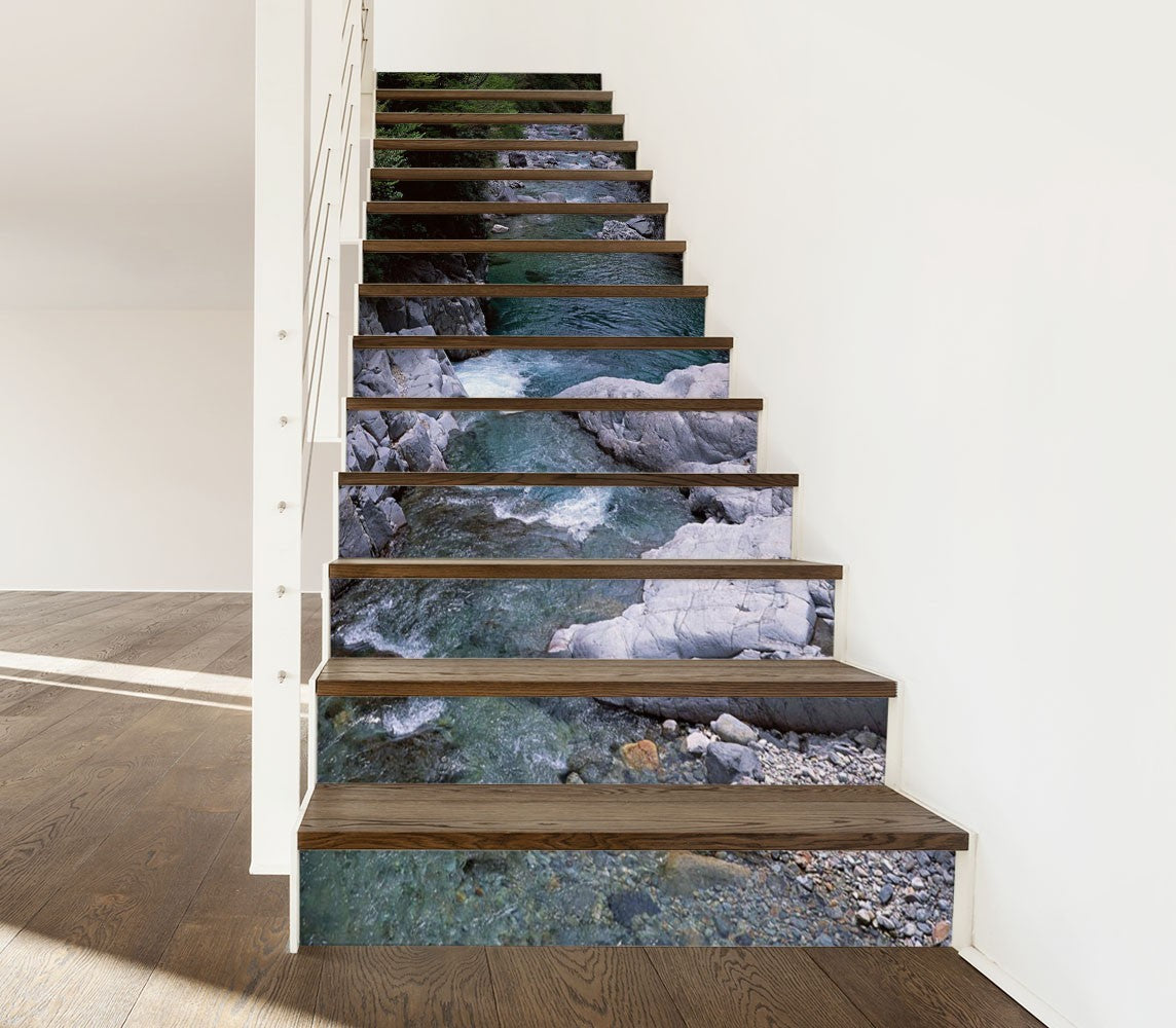 Stream Rock Nature Mountain Blue Stair Riser Decals, Waterproof Removable Staircase Decals, Vinyl Peel And Stick Stairs Decal Stickers