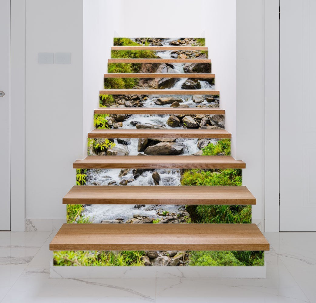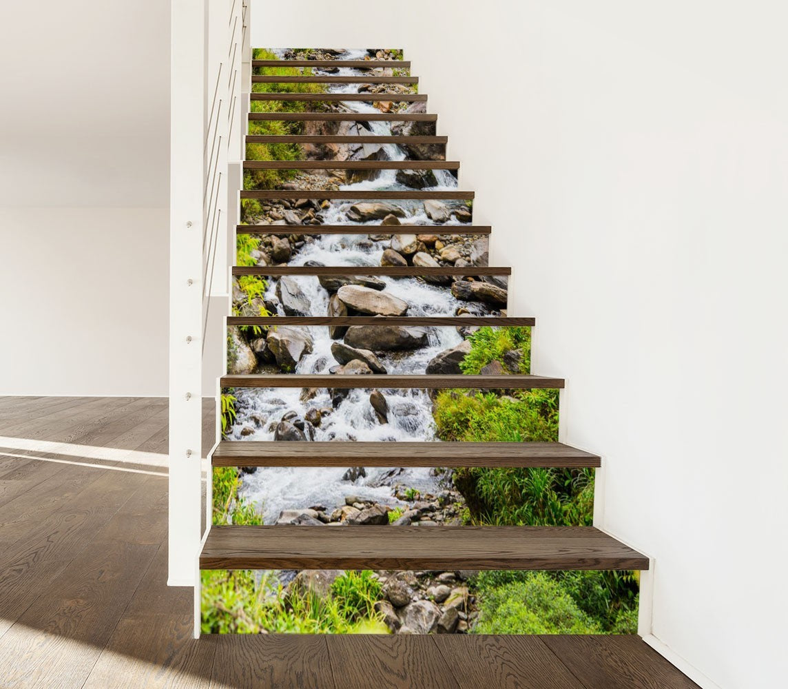 Stream Rocks Nature Rivers Lakes Green Stair Riser Decals, Waterproof Removable Staircase Decals, Vinyl Peel And Stick Stairs Decal Stickers