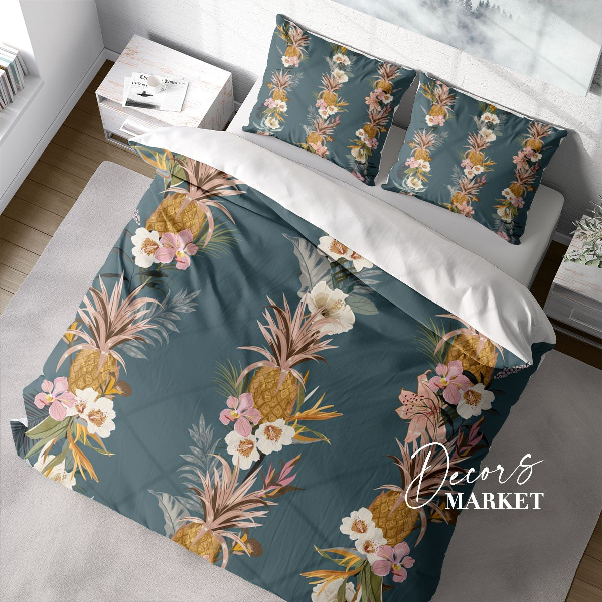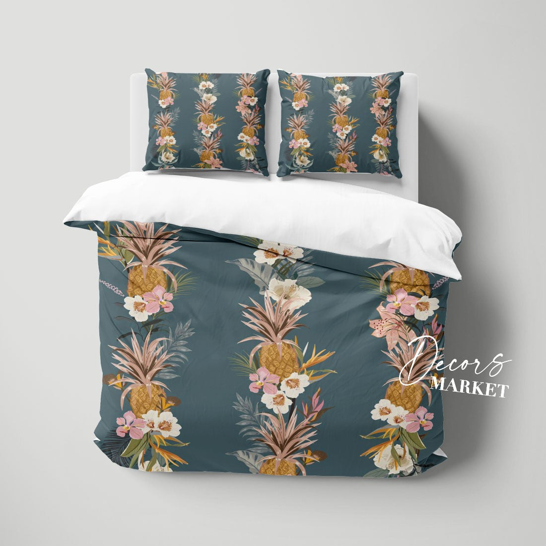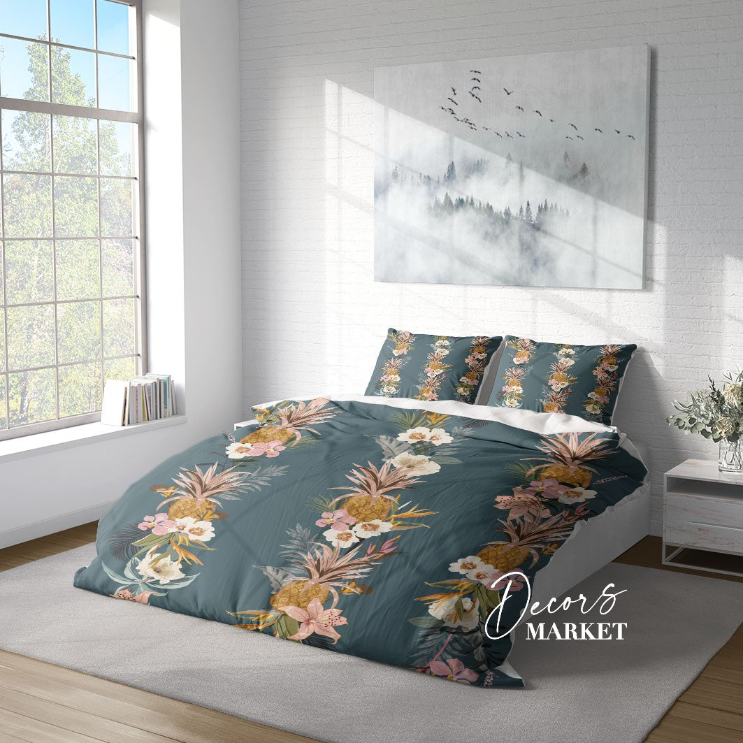 Summer Tropical Pineapple Duvet Cover Set w Pillowcases, Blue Floral Patterns 3D Quilt Cover, 3pc Single Double Queen King Size Doona Cover