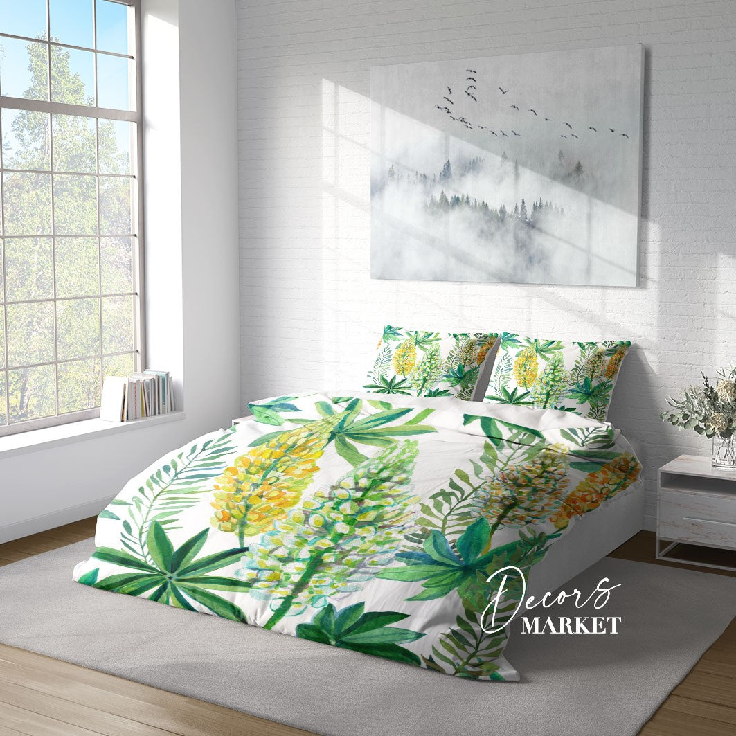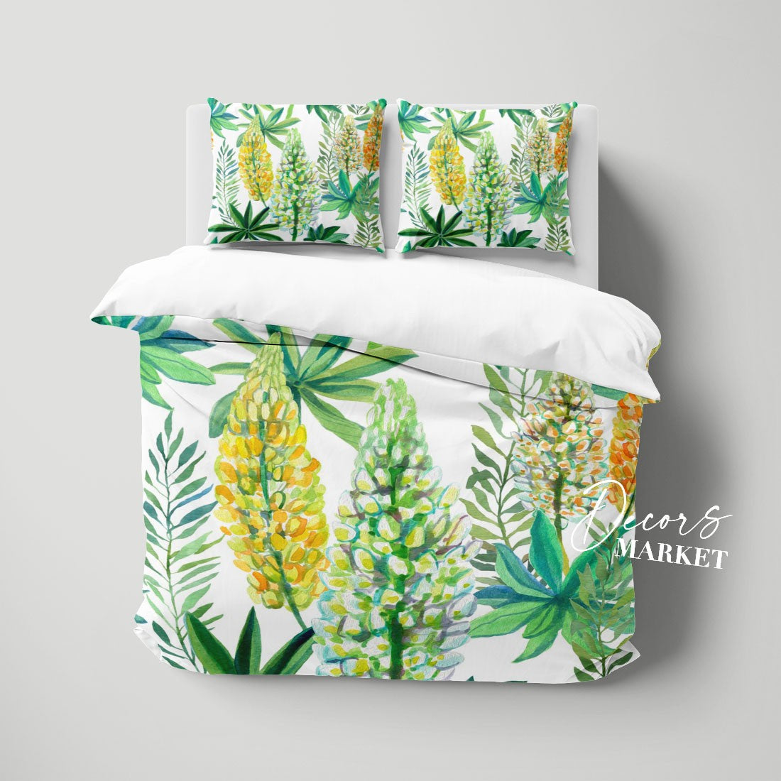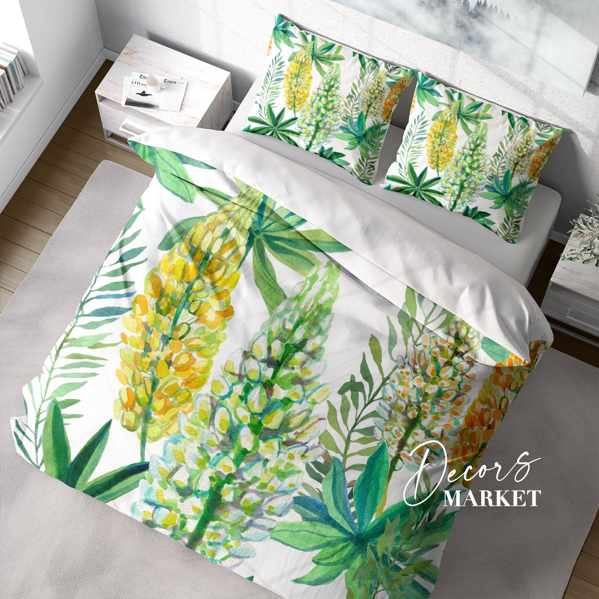 Summer Yellow Lupin Duvet Cover Set w Pillowcases, Green Floral Patterns 3D Quilt Cover, 3pc Single Double Queen King Size Doona Cover