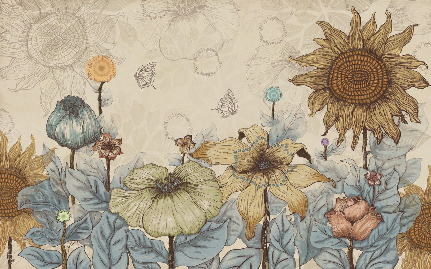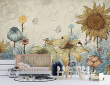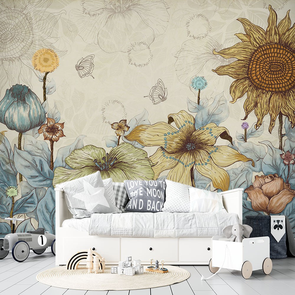 Sun Flower Butterfly Kids Colorful Brown Wallpaper Mural,Self-Adhesive Peel And Stick 3D Wall Paper,Removable Designer Wall Decor