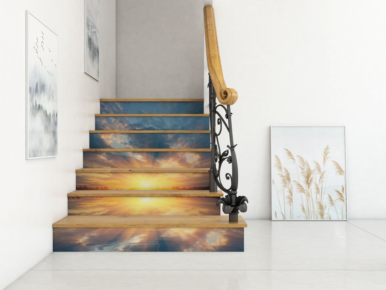 Sunrise Sunset Nature Sky Gold Stair Riser Decals, Waterproof Removable Staircase Decals, Vinyl Peel And Stick Stairs Decal Stickers