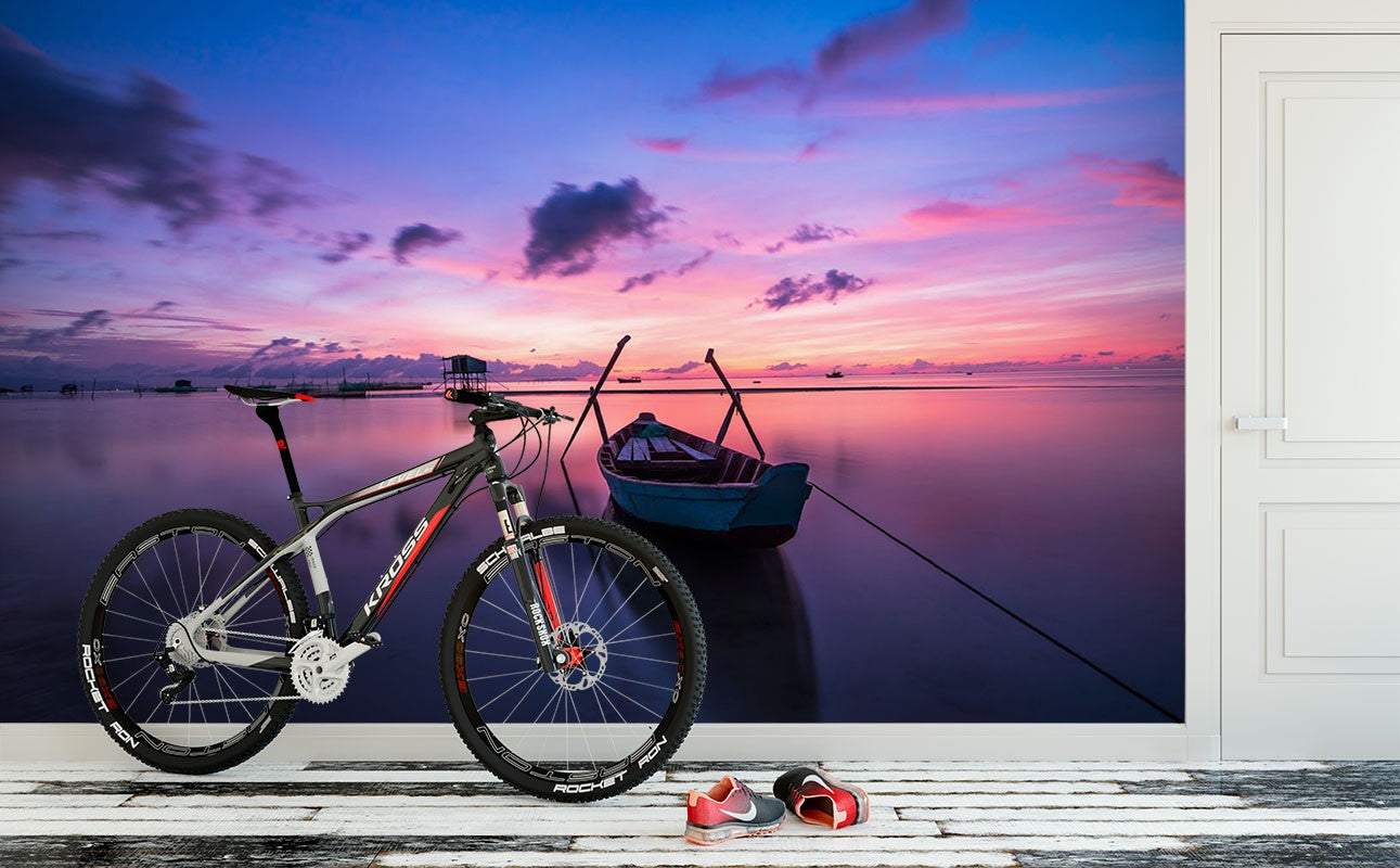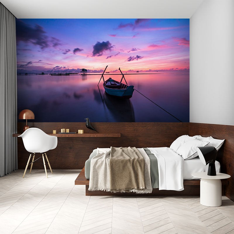 Sunset Boat Beach Purple Wallpaper Mural,Self-Adhesive Peel And Stick 3D Wall Paper,Removable Bedroom Wall Decor