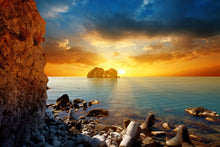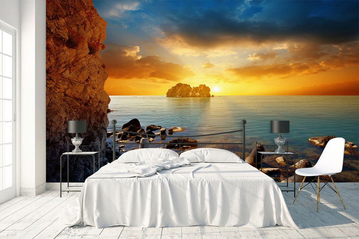 Sunset Cliff Beach Seas Oceans Gold Wallpaper Mural,Self-Adhesive Peel And Stick 3D Wall Decal,Bedroom Removable Wall Decor
