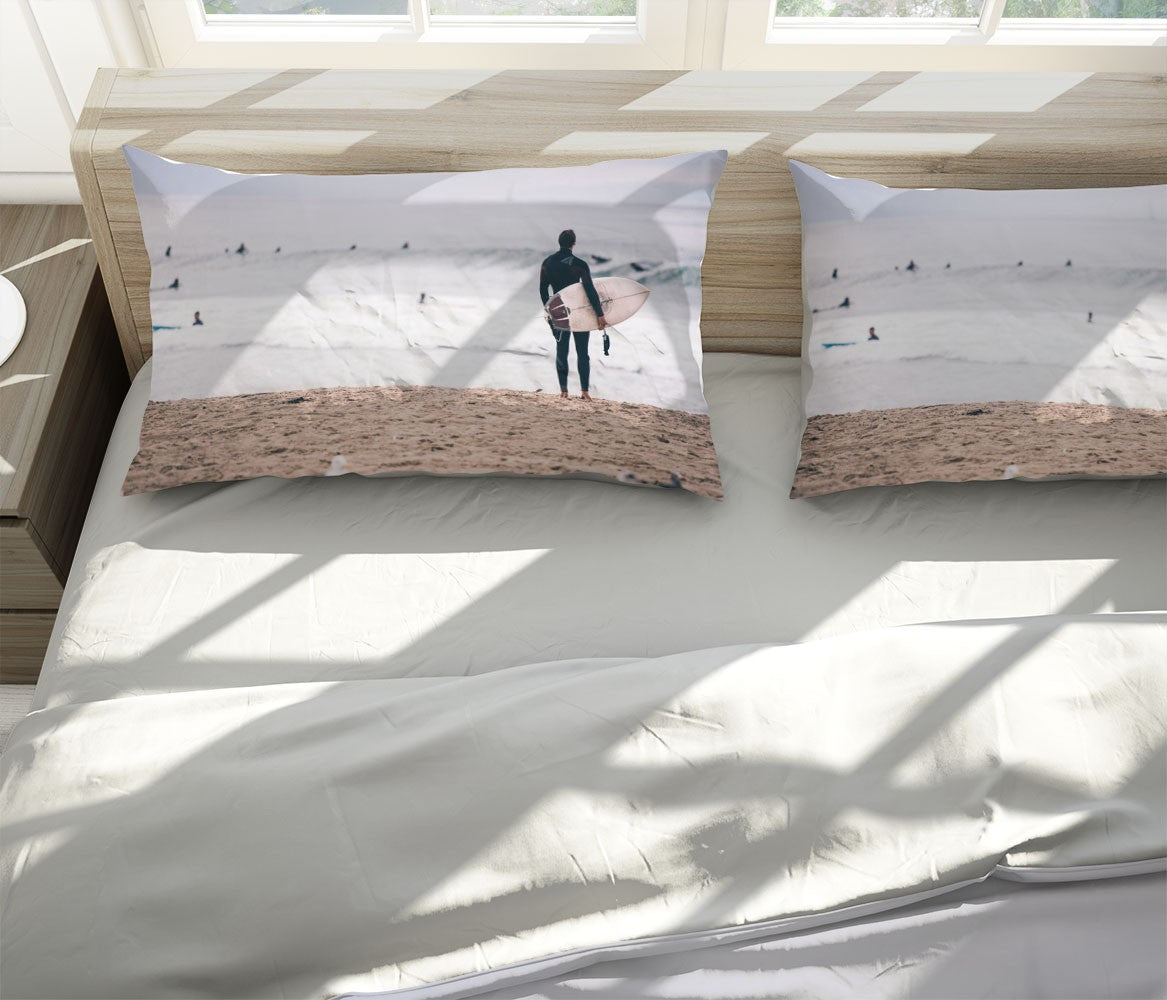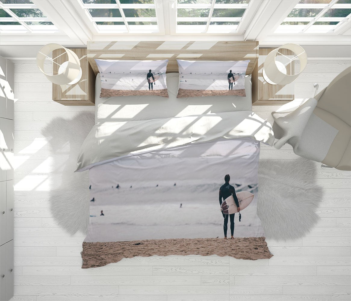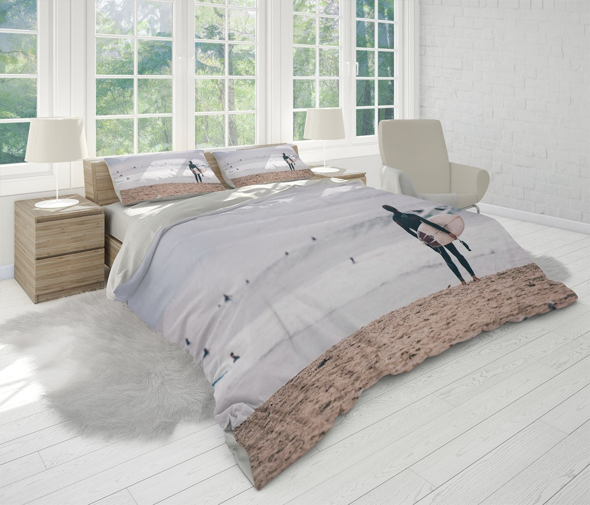 Surfing Seagull Beach Gray 3D Duvet Cover Set W Pillow Cover, Single Double Queen King Size, Printed Cotton Quilt Doona Cover 3 Pcs