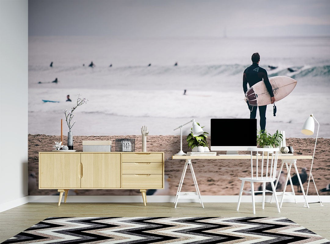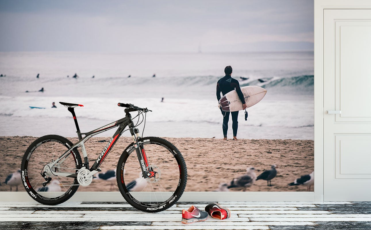Surfing Seagull Beach Gray Wallpaper Mural,Self-Adhesive Peel And Stick 3D Wall Art,Removable Bedroom Wall Decor