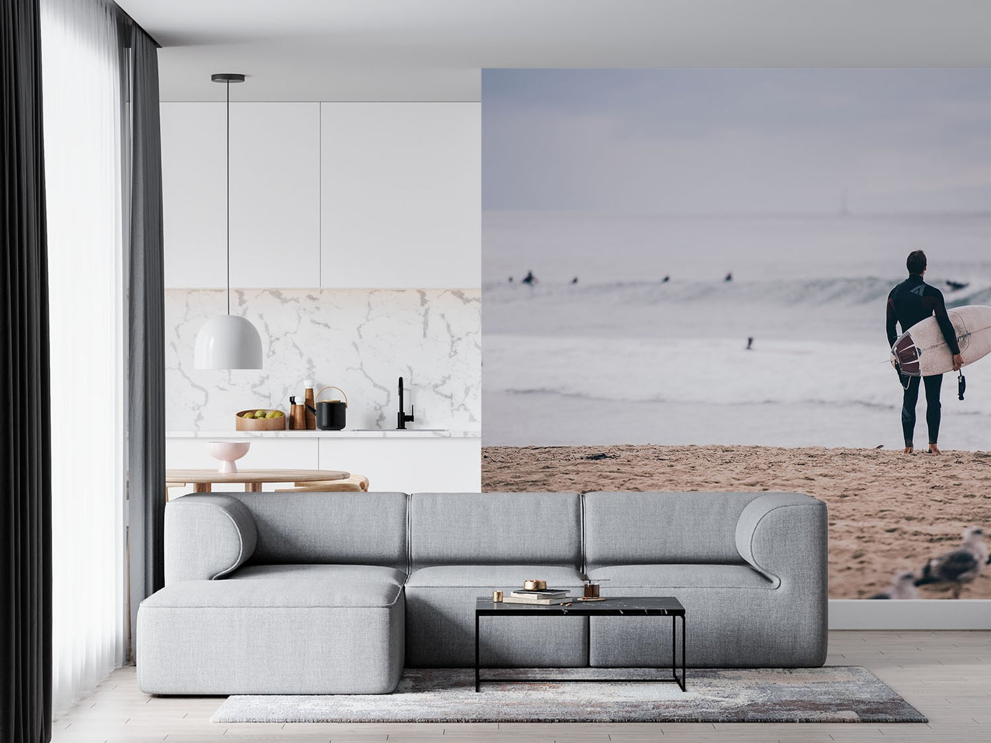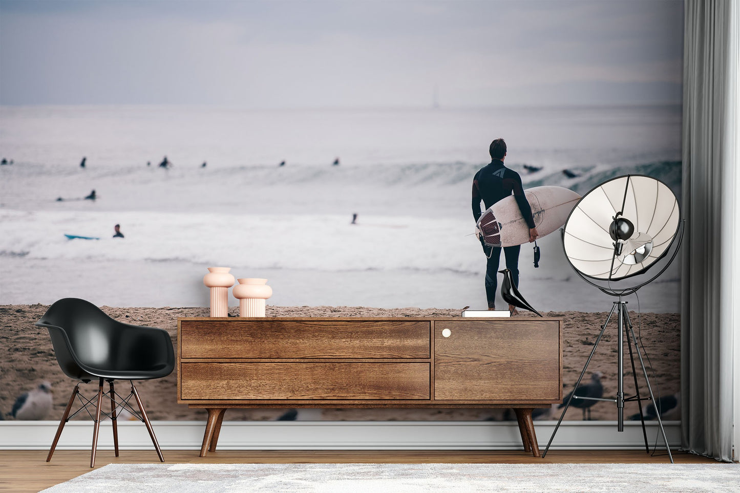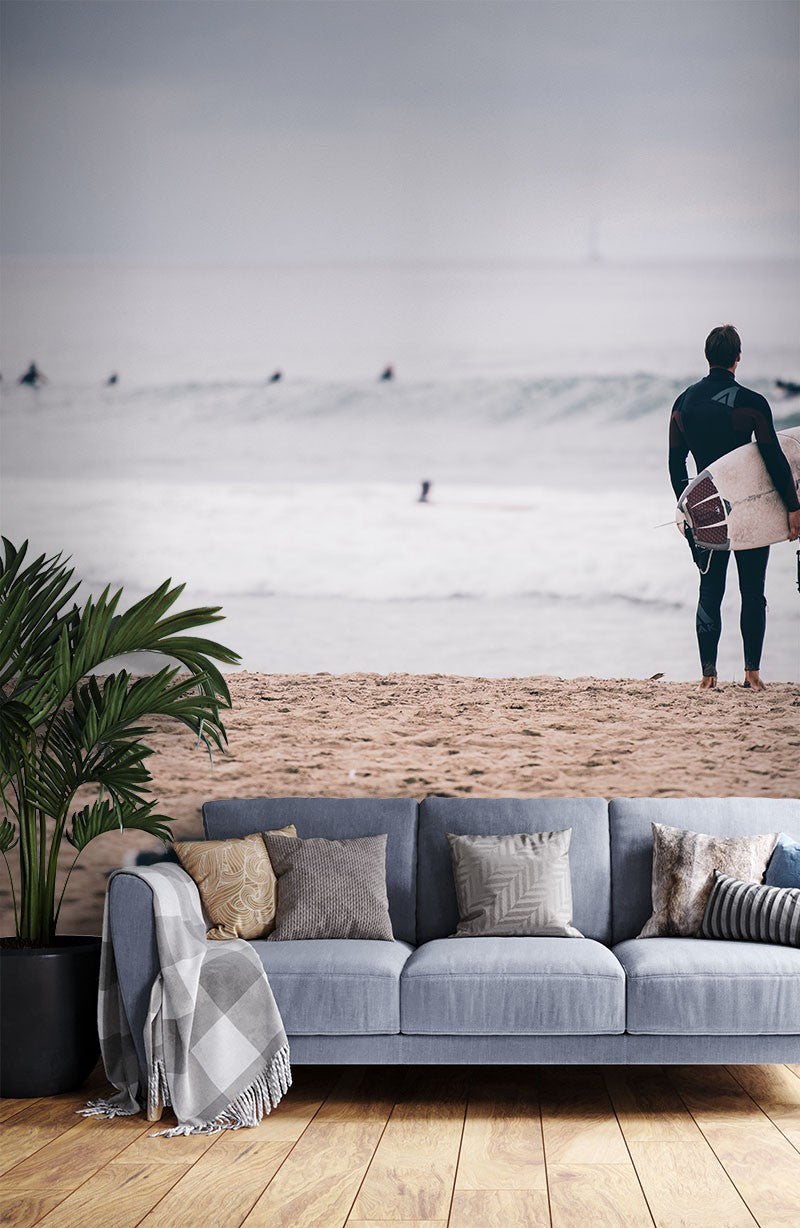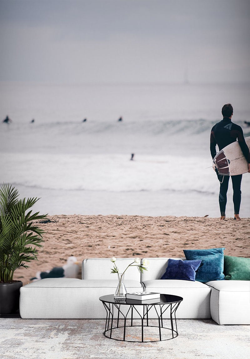 Surfing Seagull Beach Gray Wallpaper Mural