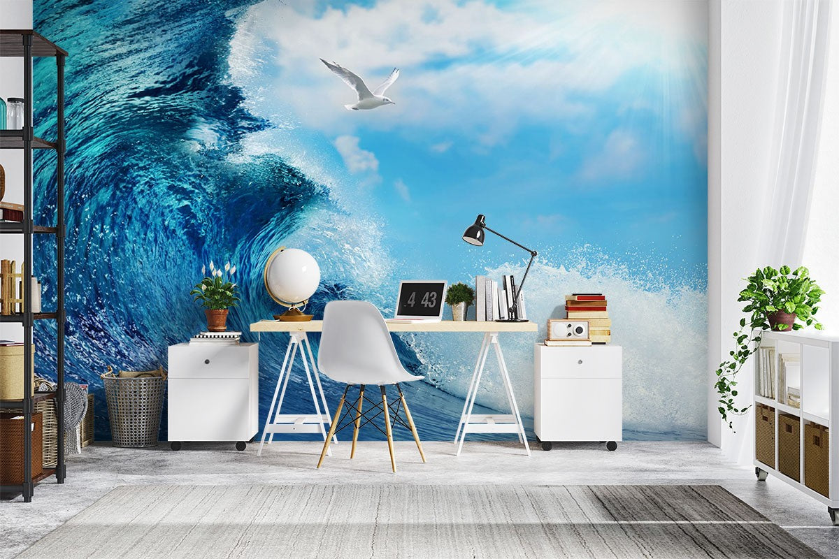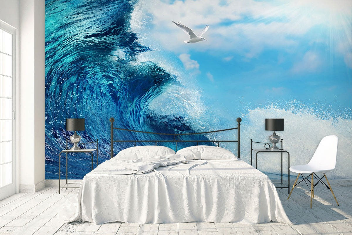 Surfing Seagull Beach Wave Blue Wallpaper Mural,Self-Adhesive Peel And Stick 3D Wall Art,Australian Company Removable Wall Decor