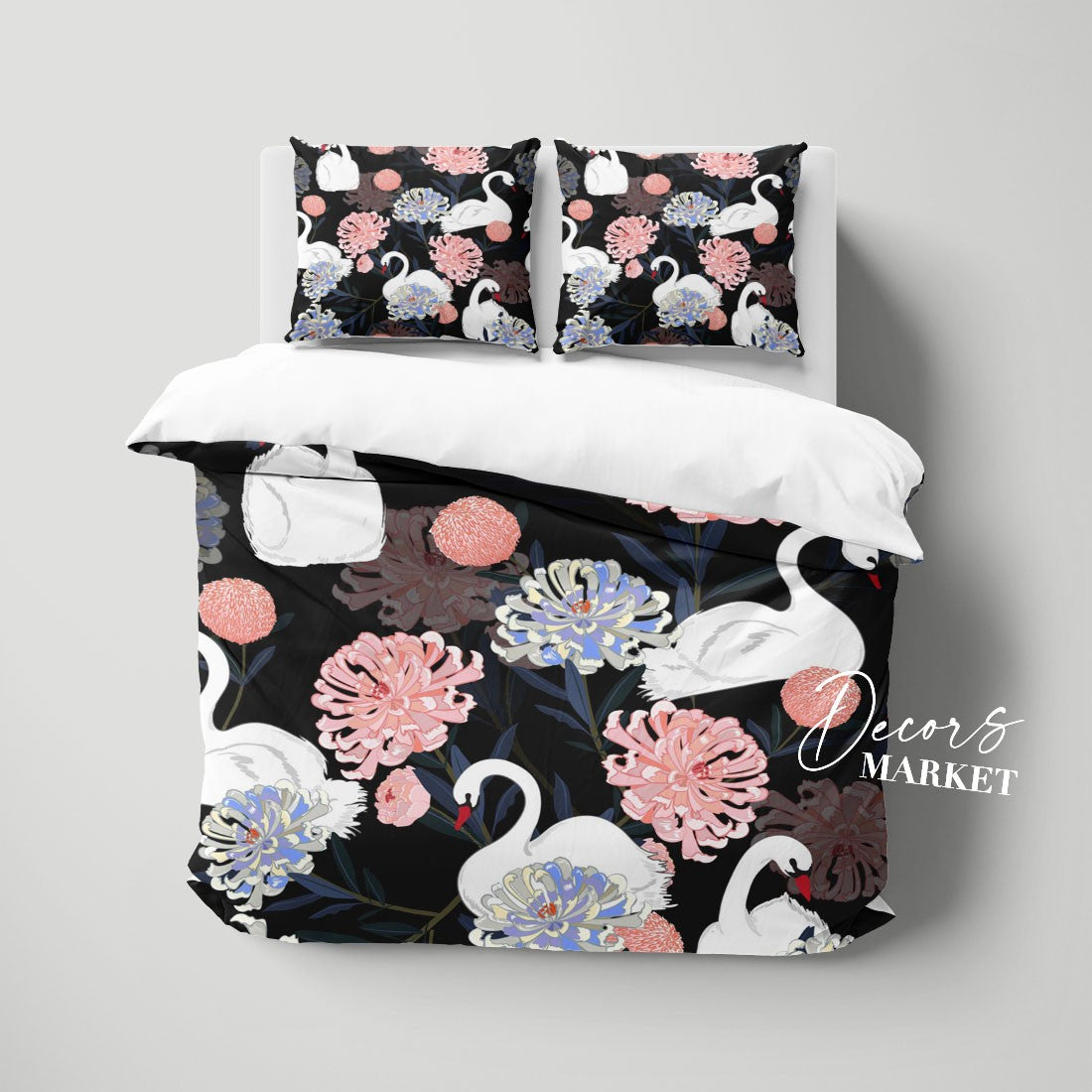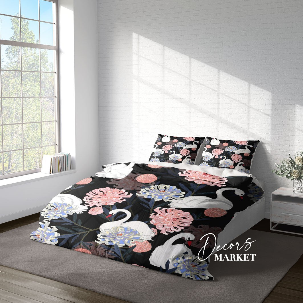 Swan Chrysanthemum Duvet Cover Set w Pillowcases, Black&White Floral Patterns 3D Quilt Cover, 3pc Single Double Queen King Size Doona Cover