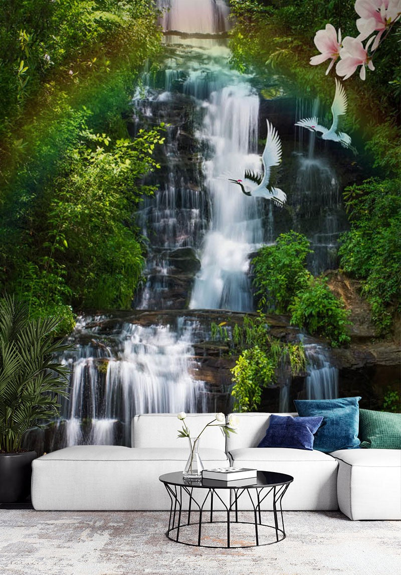 Swan Nature Waterfall Green Wallpaper Mural