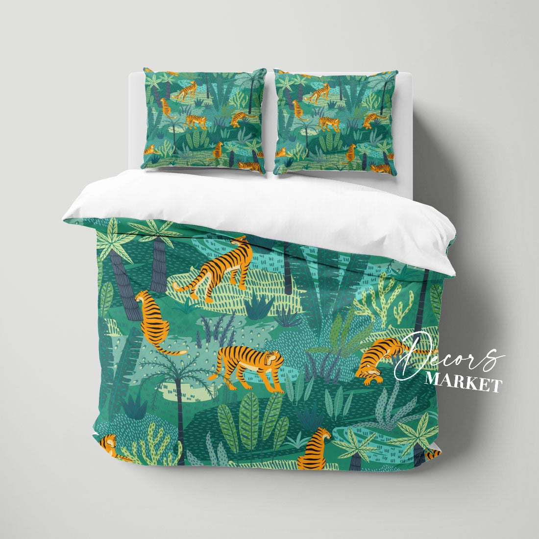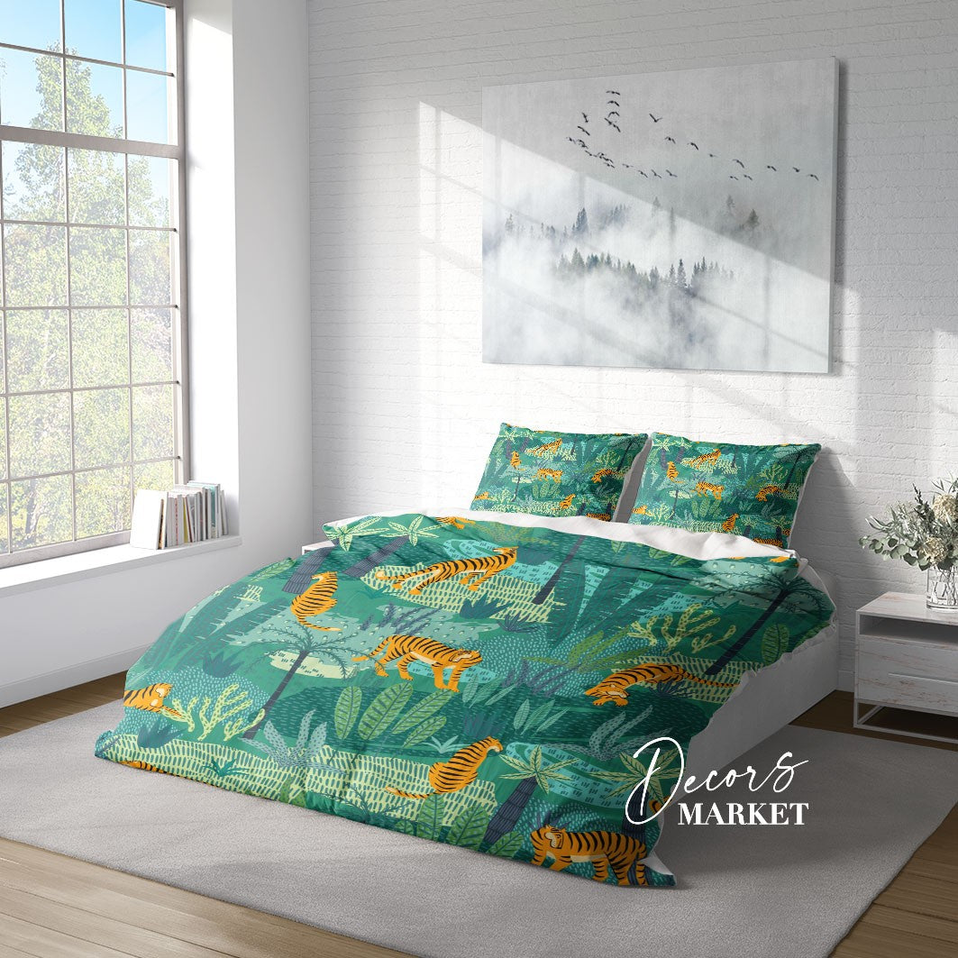 Tiger Jungle Duvet Cover Set w Pillowcases, Green Orange Floral Leaves 3D Quilt Cover, 3pc Single Double Queen King Size Doona Cover