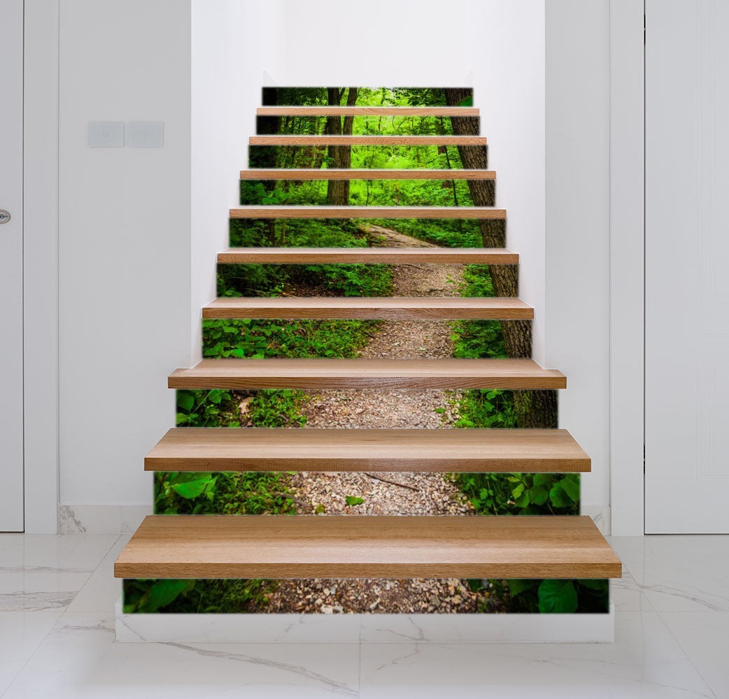 Trail In The Woods Forest Plant Green Stair Riser Decals, Waterproof Removable Staircase Decals, Vinyl Peel And Stick Stairs Decal Stickers
