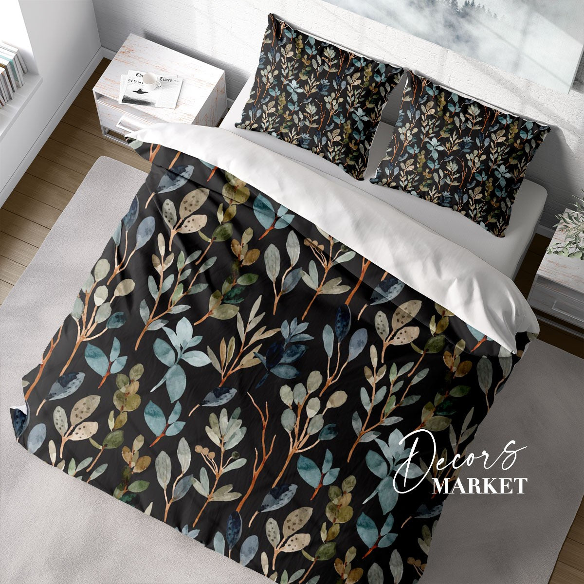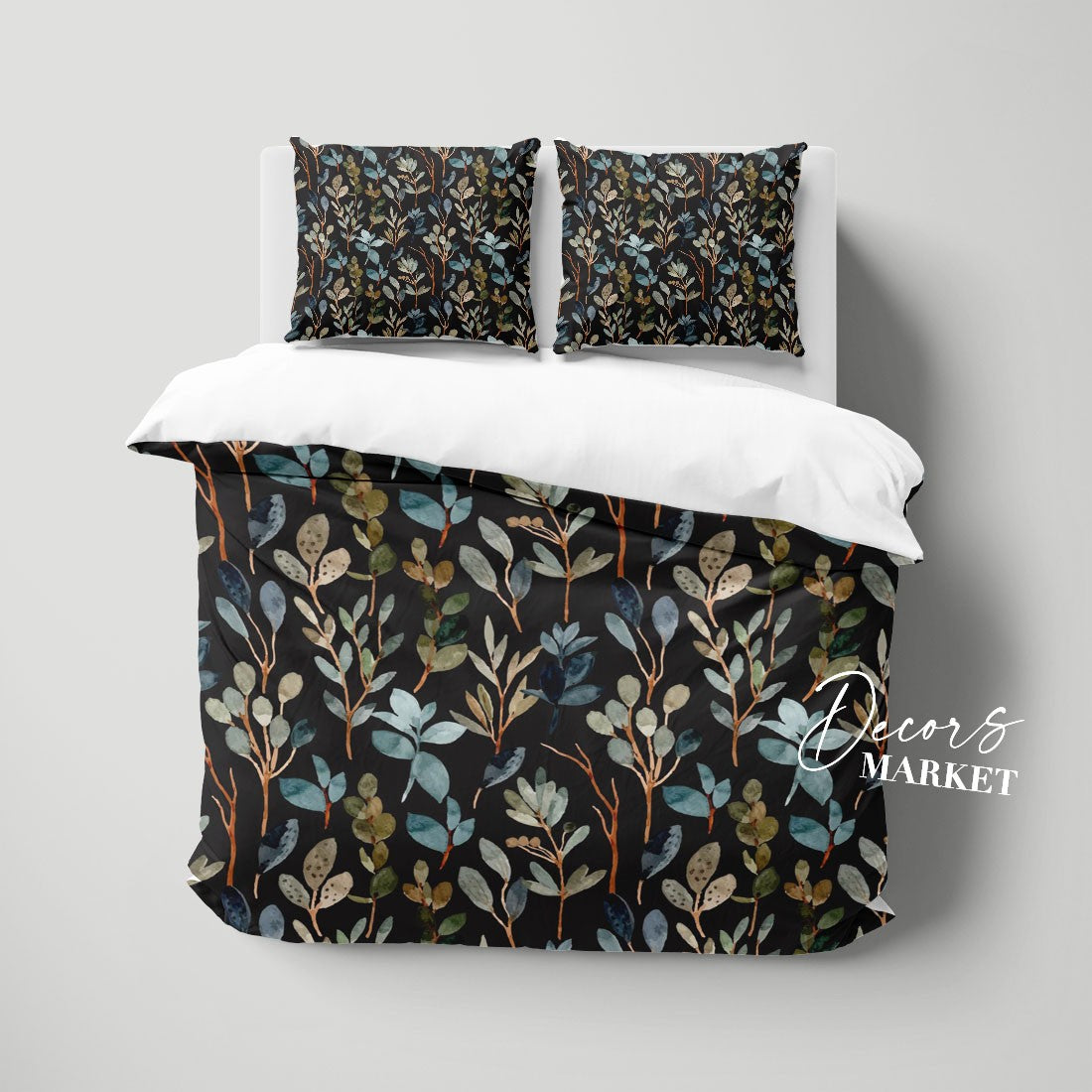 Tree Branches Duvet Cover Set w Pillowcases, Dark bg Floral Leaves 3D Quilt Cover, 3pc Single Double Queen King Size Doona Cover