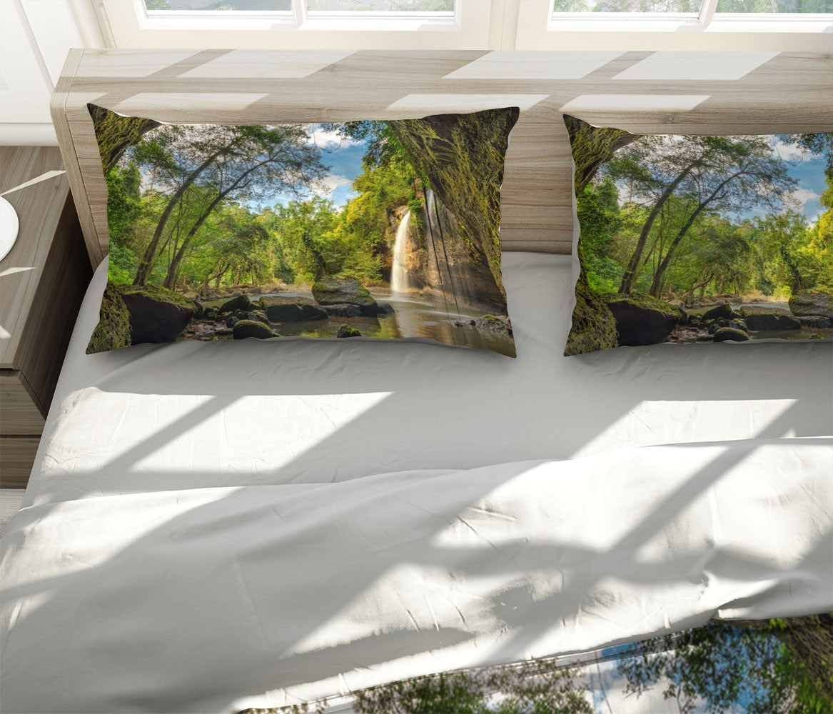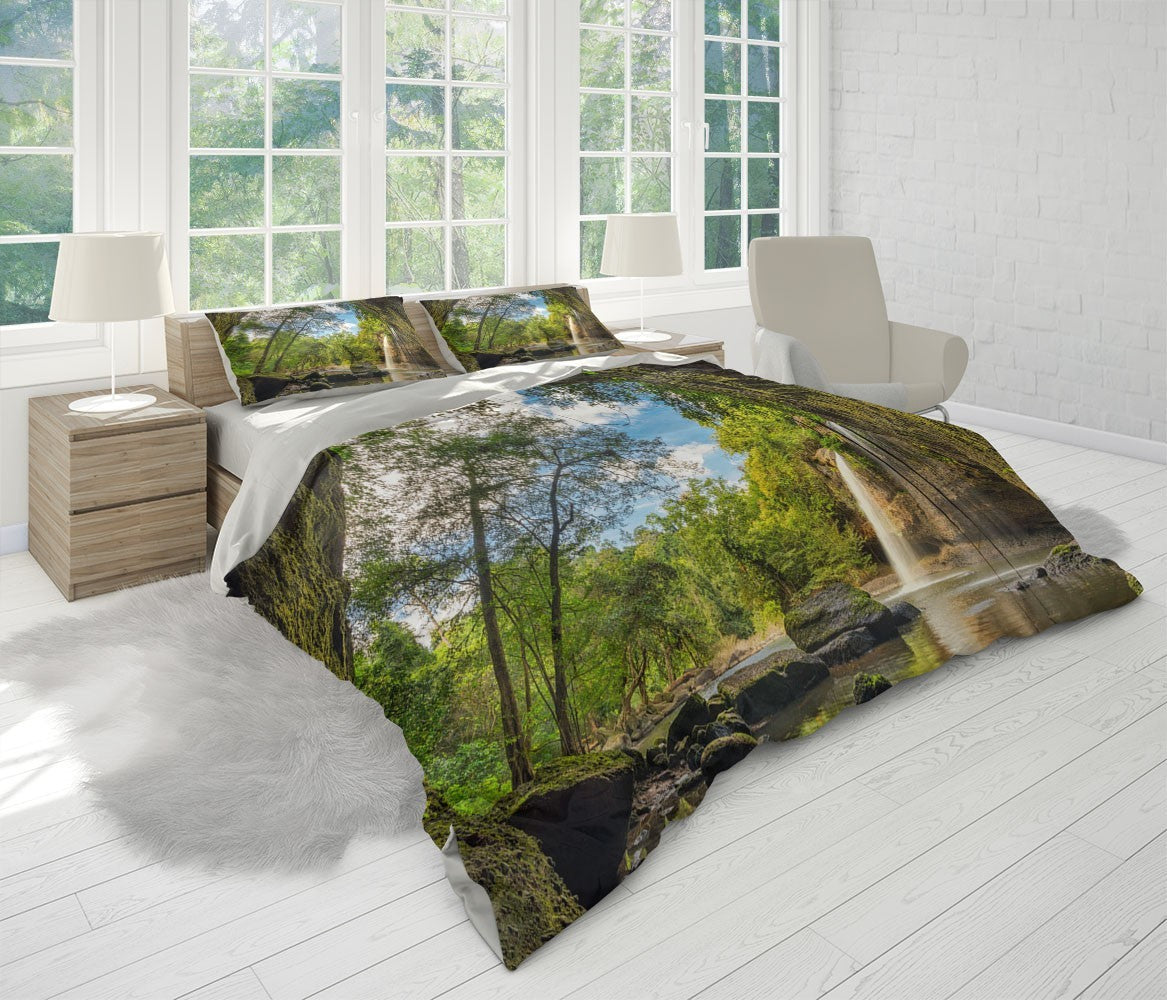 Tree Rock Duvet Cover Set W Pillow Cover, Green Nature Waterfall 3D Quilt Cover, Single Double Queen King Size Doona Cover