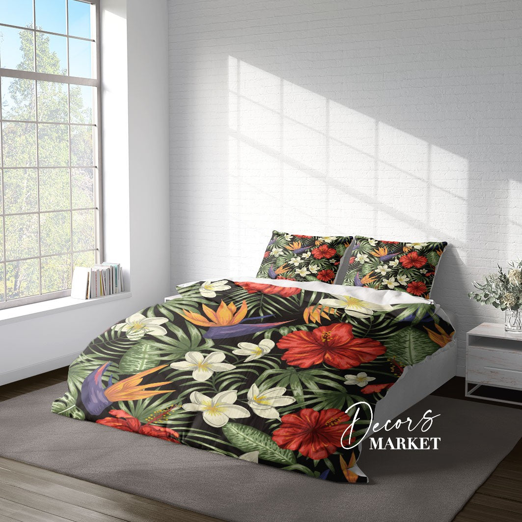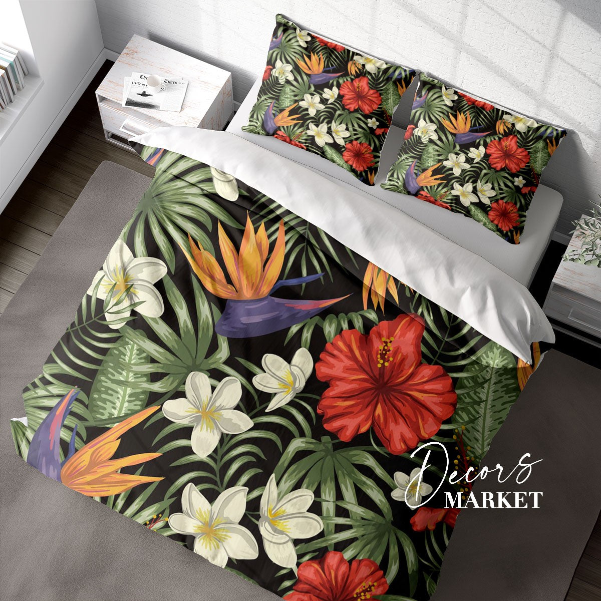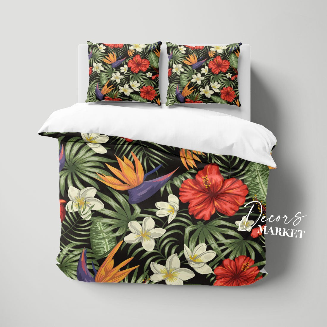 Tropical Flowers Duvet Cover Set w Pillowcases, Green Floral Patterns 3D Quilt Cover, 3pc Single Double Queen King Size Doona Cover