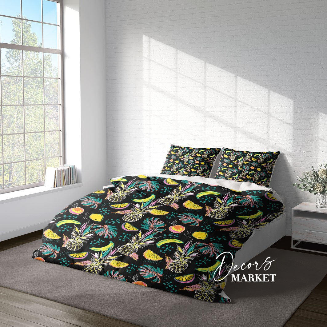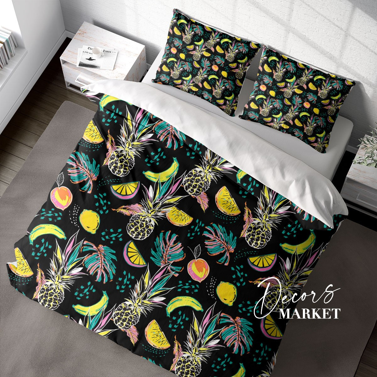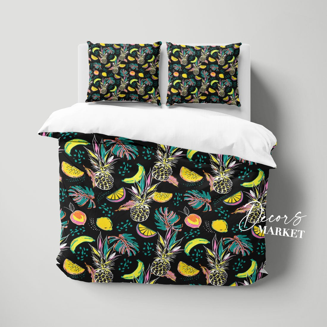 Tropical Fruits Pineapple Duvet Cover Set w Pillowcases, Yellow Floral Pattern 3D Quilt Cover, 3pc Single Double Queen King Size Doona Cover
