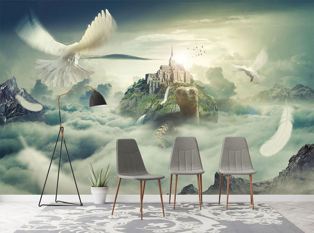Turtle Castle Art Fantasy Green Wallpaper Mural,Self-Adhesive Peel And Stick 3D Wall Decor,Bedroom Removable Wall Decor