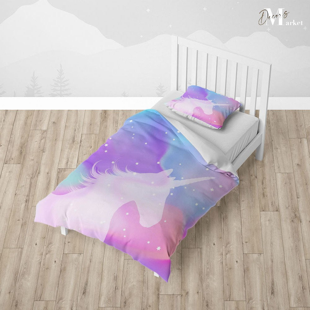 Unicorn Aurora Dream Duvet Cover Set w Pillow Cover, Purple Kids Fantasy 3D Quilt Cover, Single Double Queen King Size Doona Cover