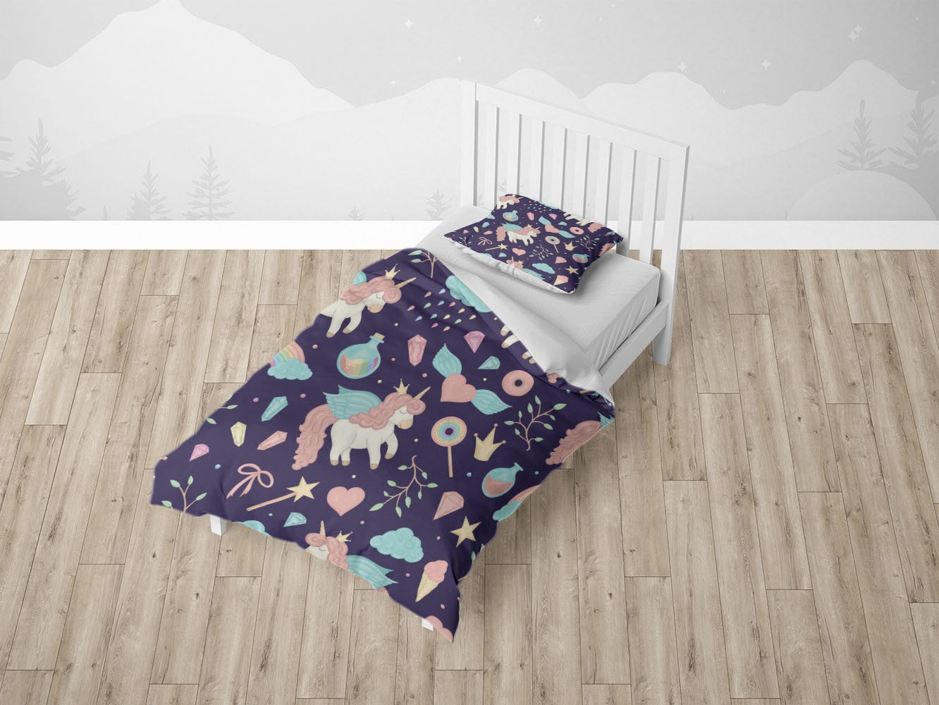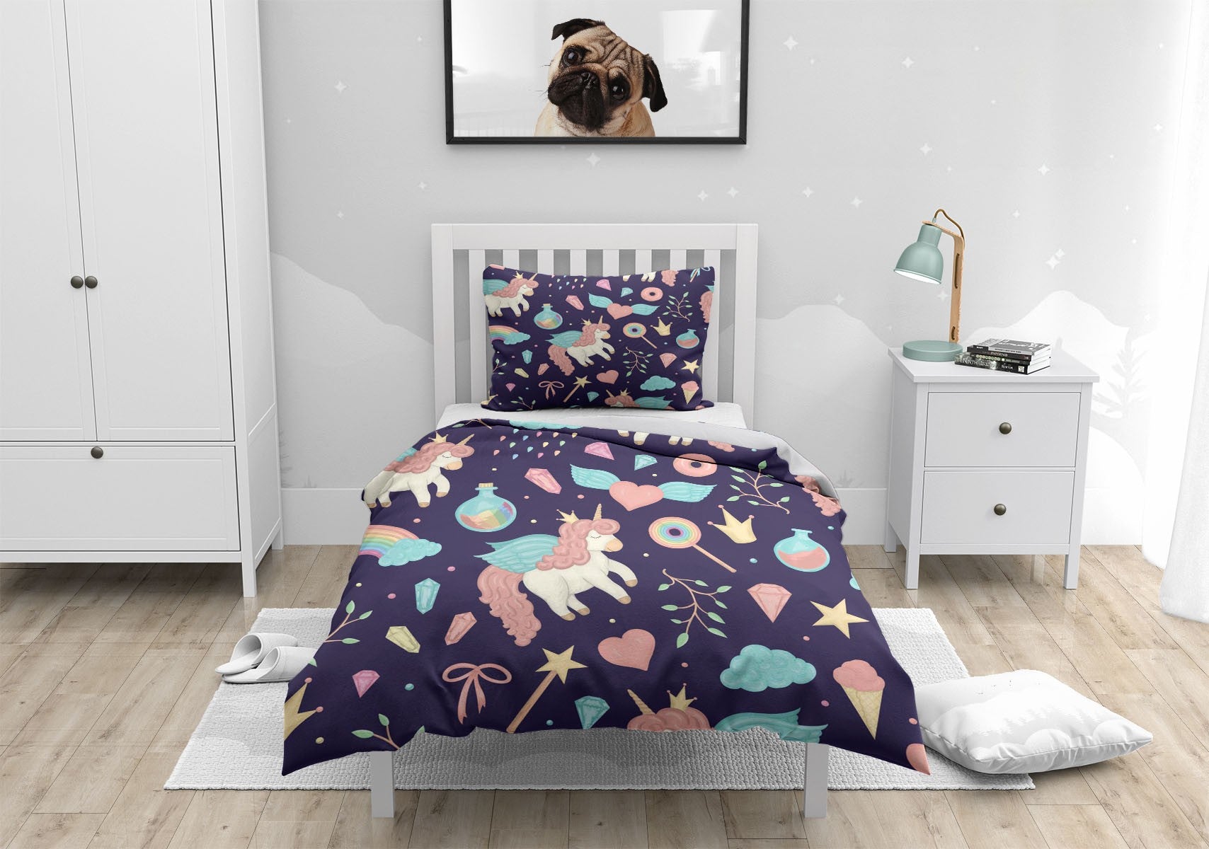Unicorn Dream Magic Duvet Cover Set w Pillowcases, Purple Kids Patterns 3D Quilt Cover, 3pc Single Double Queen King Size Doona Cover