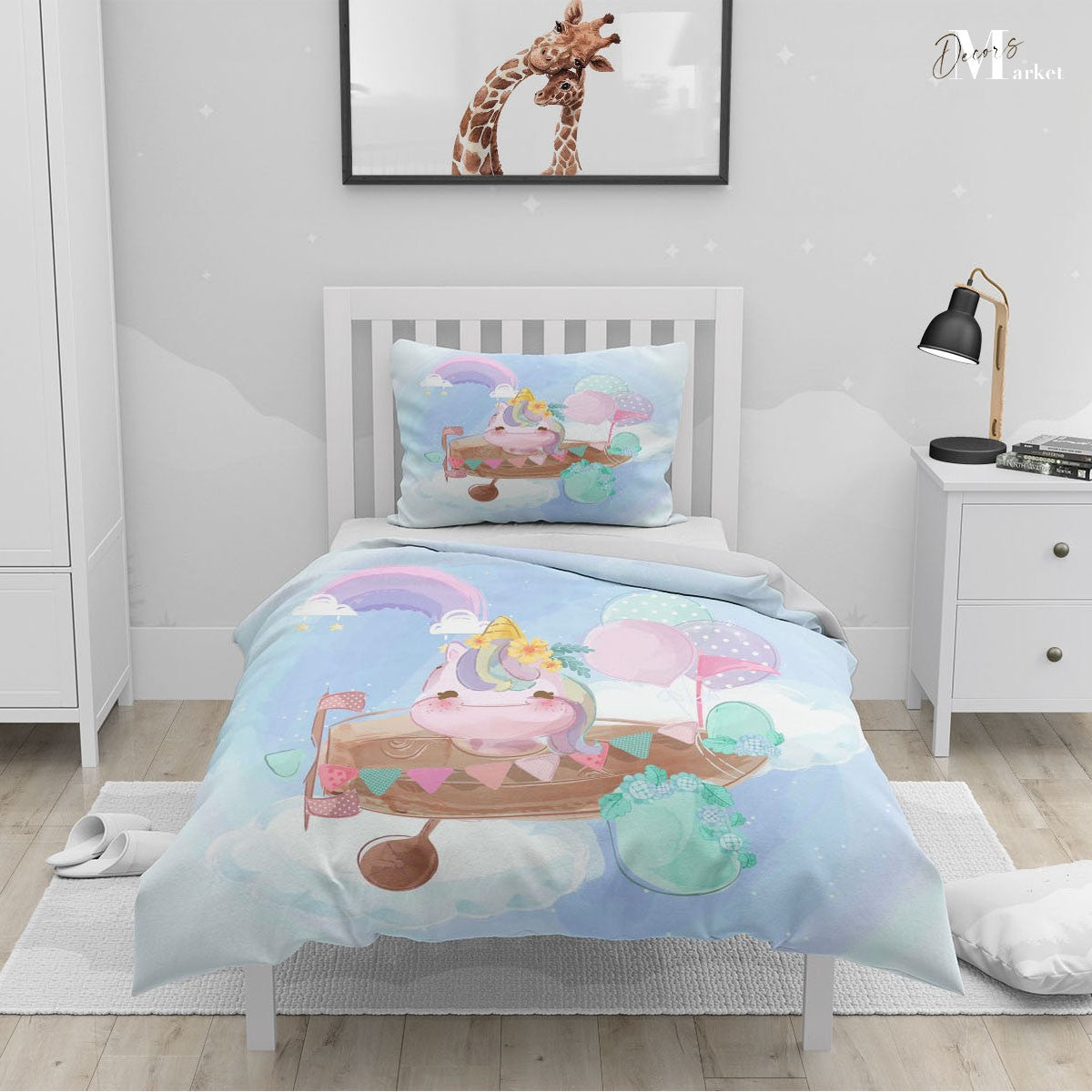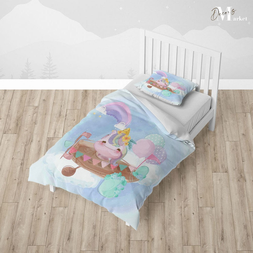 Unicorn Plane Balloon Duvet Cover Set w Pillow Cover, Blue Kids Cartoon 3D Quilt Cover, Single Double Queen King Size Doona Cover