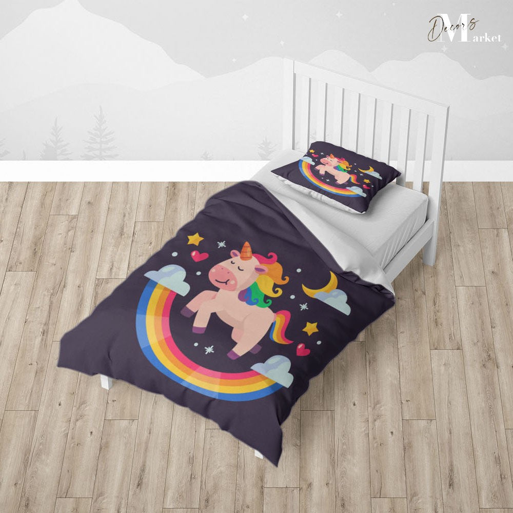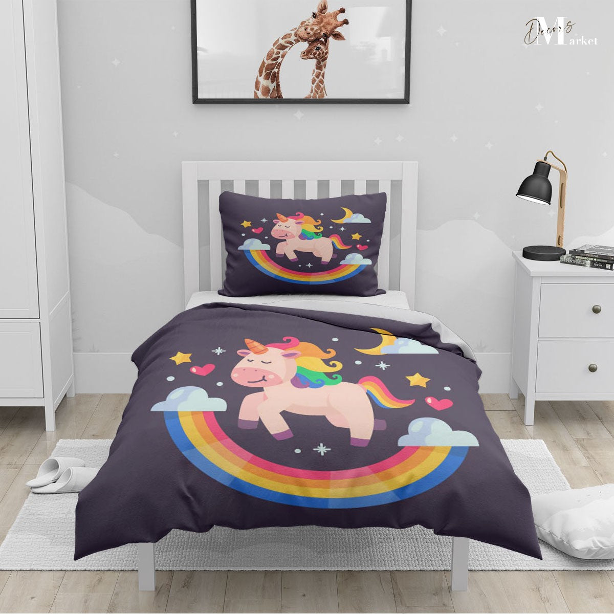 Unicorn Rainbow Star Duvet Cover Set w Pillow Cover, Multicolour Kids Cartoon 3D Quilt Cover, Single Double Queen King Size Doona Cover