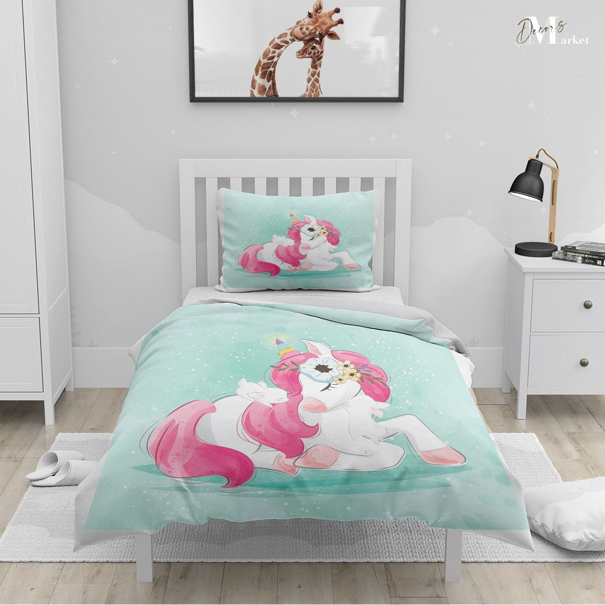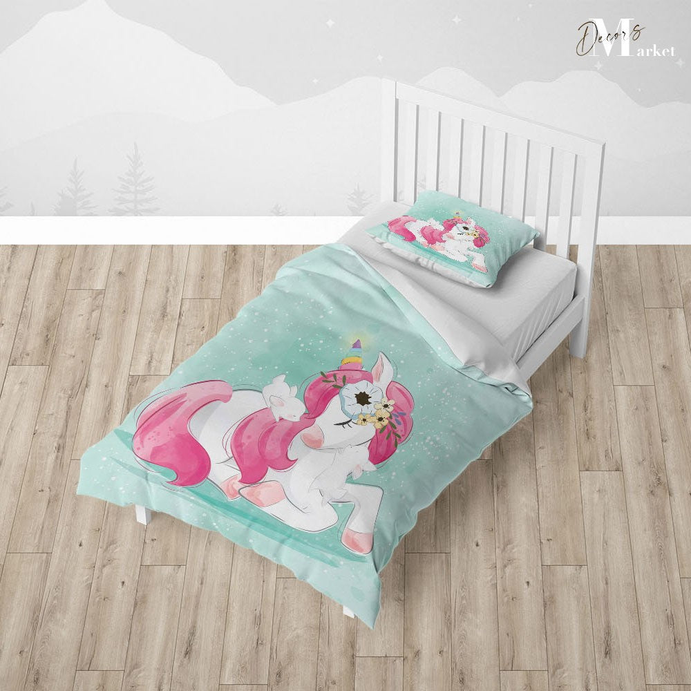 Unicorn Sleep Dream Duvet Cover Set w Pillow Cover, Green Kids Cartoon 3D Quilt Cover, Single Double Queen King Size Doona Cover