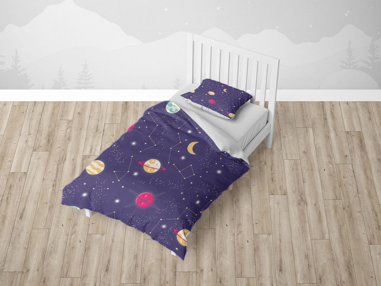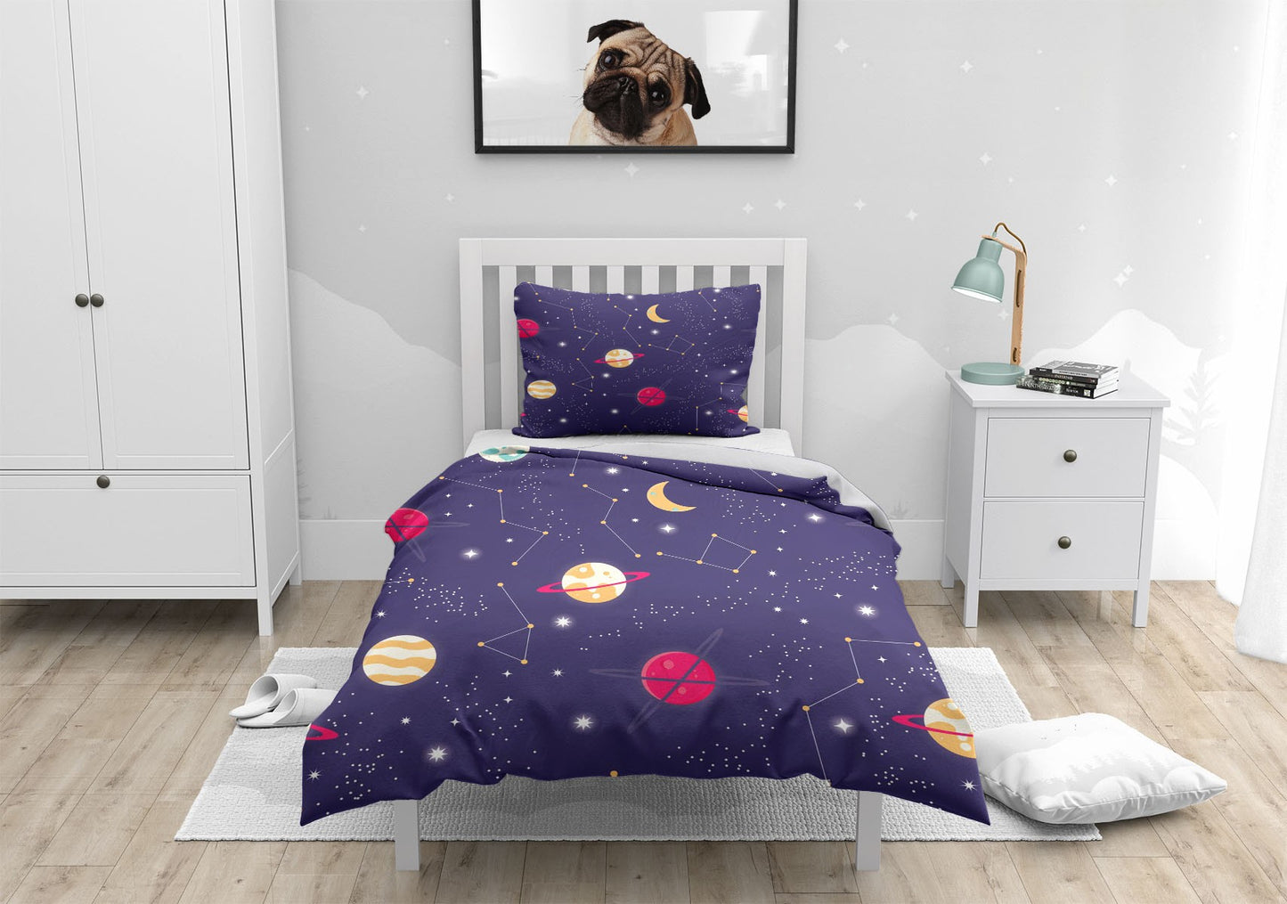 Universe Planet Moon Duvet Cover Set w Pillowcases, Purple Kids Patterns 3D Quilt Cover, 3pc Single Double Queen King Size Doona Cover