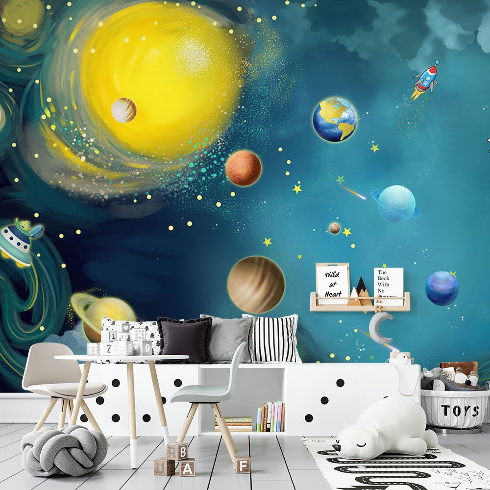 Universe Solar Kids Space Green Wallpaper Mural,Self-Adhesive Peel And Stick 3D Wall Decor,Designer Australian Company Wall Decor